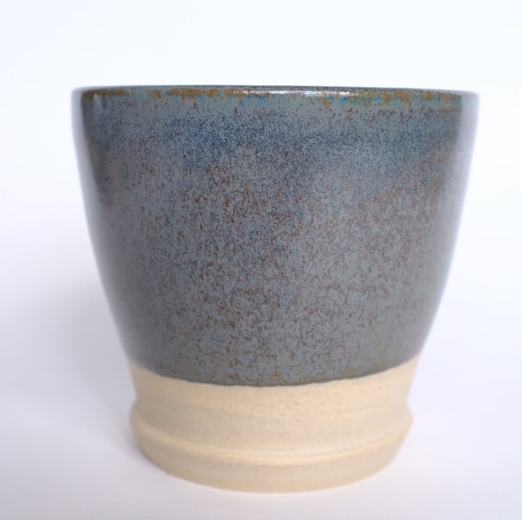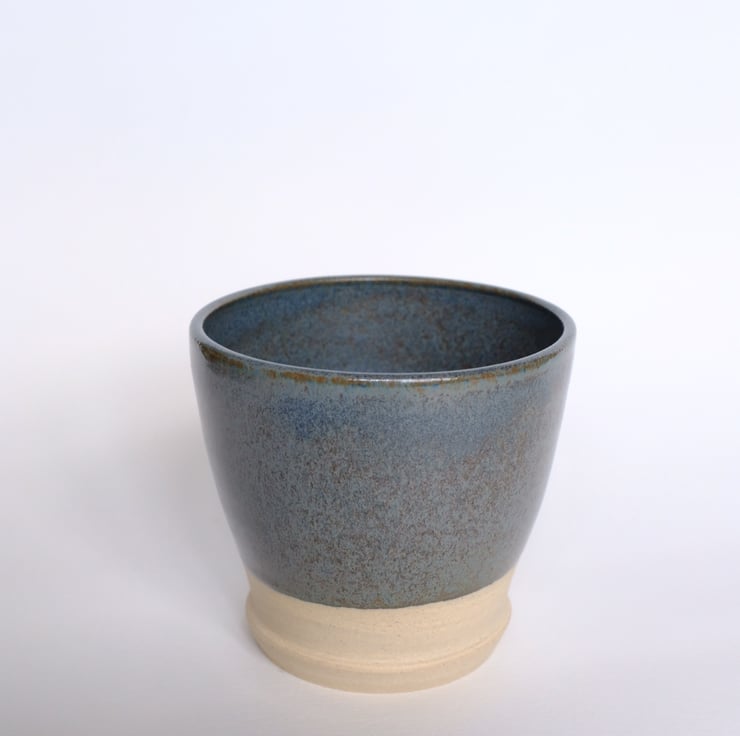 Hand thrown, dark blue plant pot, ideal for small cacti, succulents or indoor plants. Height: 9.5cm. Base diameter: 7.1cm. Opening diameter: 9.7cm.