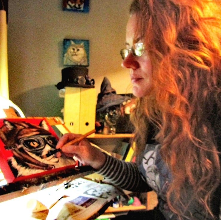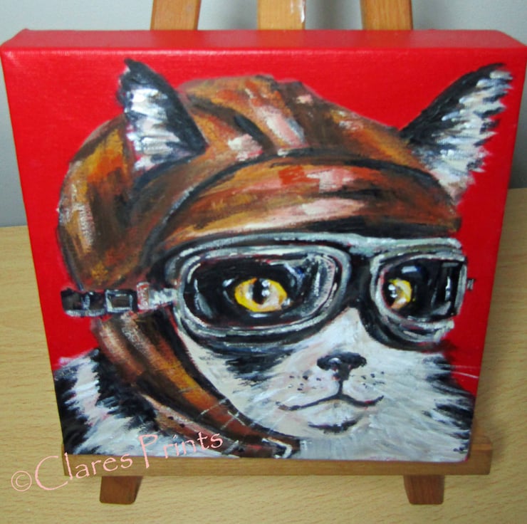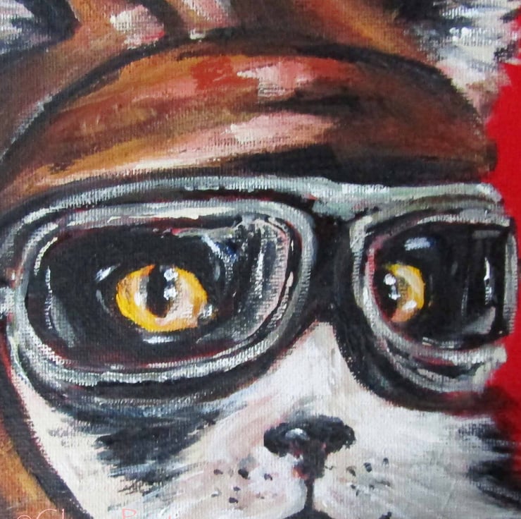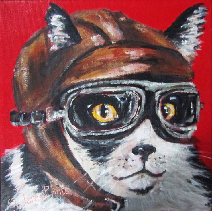 Original acrylic painting on canvas of a very cute black and white cat in it flying hat and goggles!