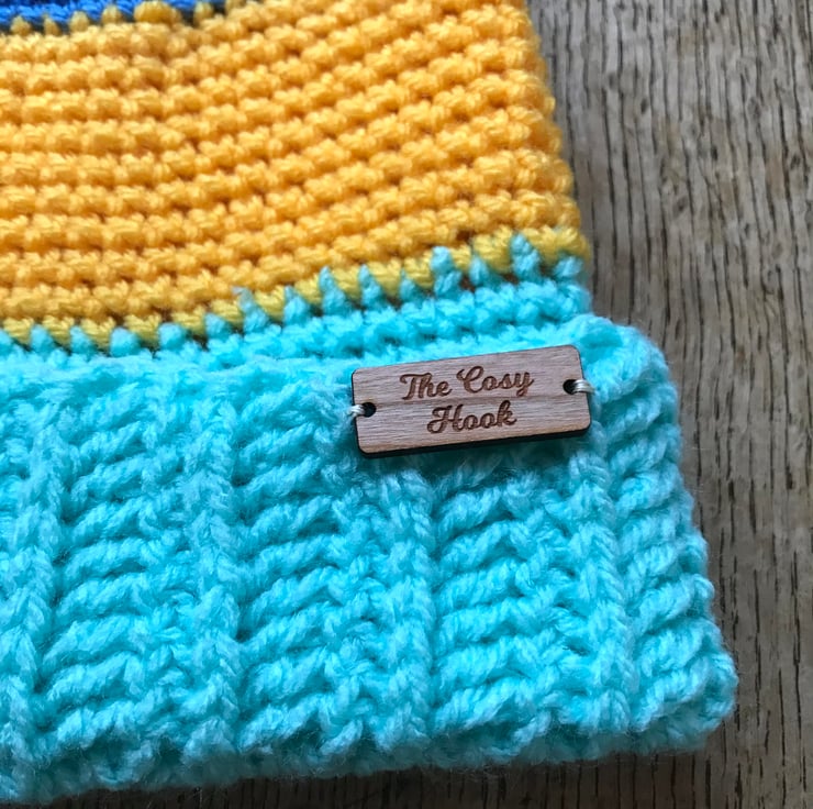 Beautiful three colour hat to fit 4 year old. Yellow, aqua and blue make this a bright and bold hat. The folded brim helps to keep little ears warm. Made in Acrylic so is washable but I recommend hand washing due to the Pom Pom.