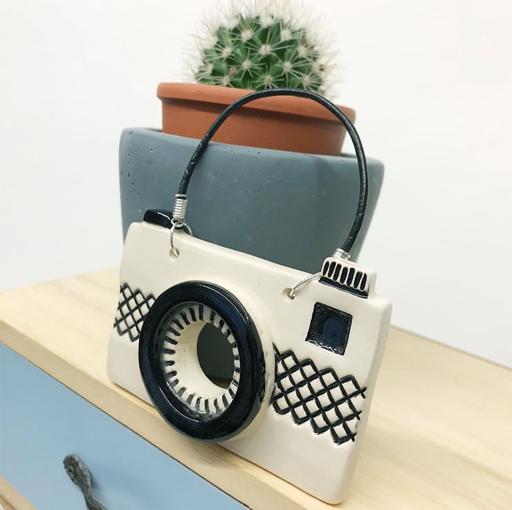 This cute little pottery camera decoration is hand cut from white earthenware clay. It has been embossed with pattern and colour and then fired once. It has then been coated in a rich, glossy, clear glaze is then fired again - so is nice and strong. It measures 8cm x 6cm and hangs from a black cord. It is glazed on the front and left plain on the back.