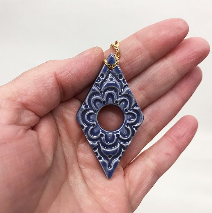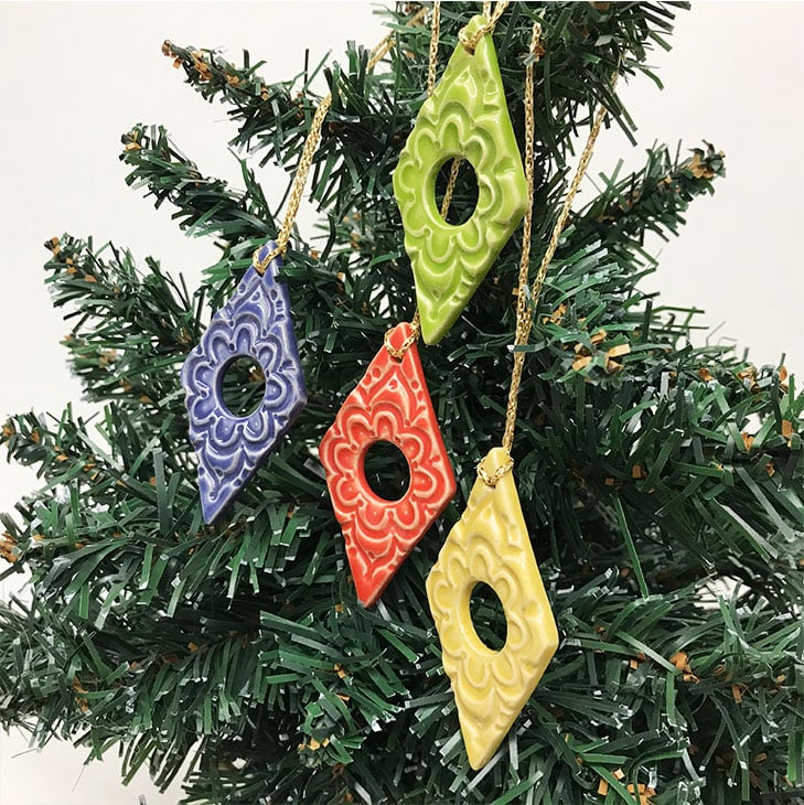 Set of Four. These little lightweight diamond decorations have been made from white earthenware clay, imprinted with bold pattern and glazed in bright, cheerful glazes. They measure 6.5cm diameter x 3.5mm deep. Glazed on the front only