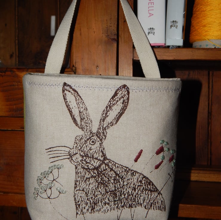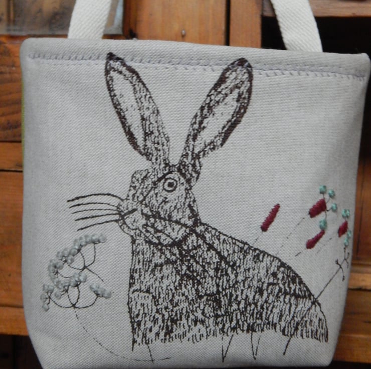 This is a small fabric basket 17cm high by 18cm wide with a depth of about 11cm (front to back). The front of the basket is a beige cotton with a screen printed hare in dark brown with wild grasses. The wild grasses have been hand embroidered. The basket has a cotton webbed strap (2cm wide) at the back to hang from a bed or furniture knob or the basket sits perfectly flat on its shaped base. The basket is lined with a material to match the front cotton and has my cornflower design in green screen printed onto it. The back of the basket is a green cotton canvas fabric.