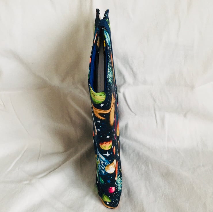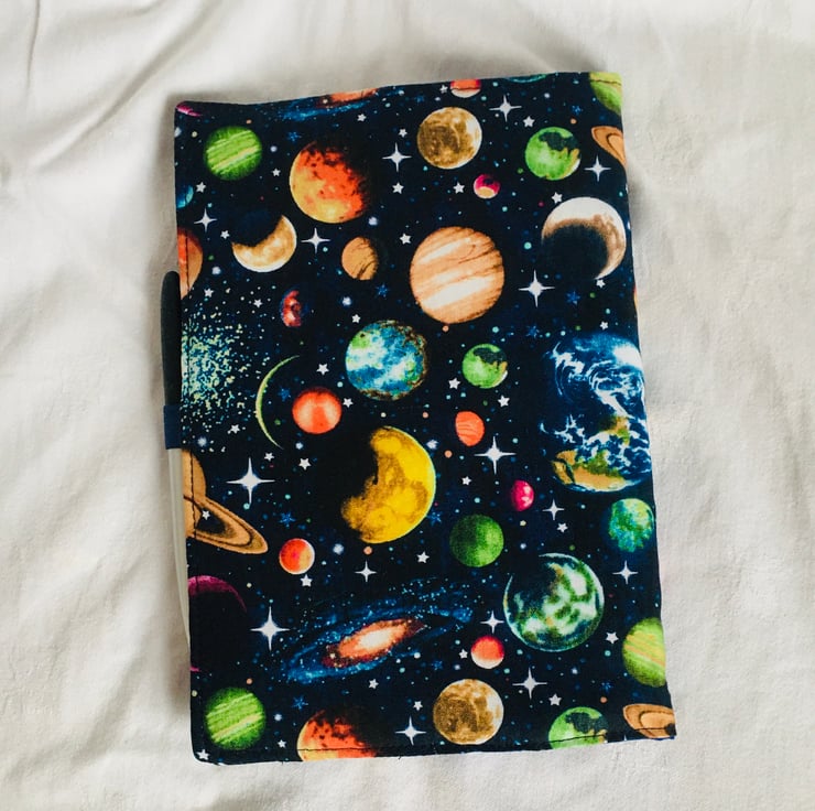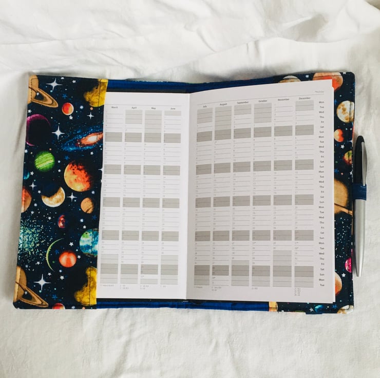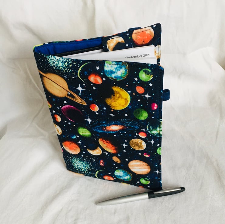 This is a beautifully covered hardback A5 week to view Diary with Pen. The cover has been made using Quilting Cotton weight fabric for the outside with Planet theme print and lined with a plain colour cotton, finished with pretty elastic closure. The cover can be removed and used time and time again. The elastic bind, helps to protect your diary from falling open, inside your bag, keeping the pages crisp and clean.
