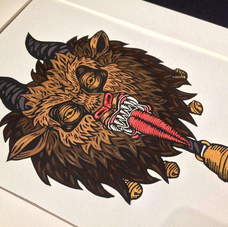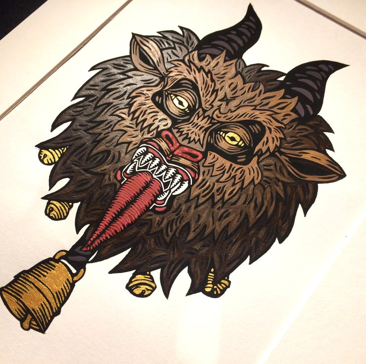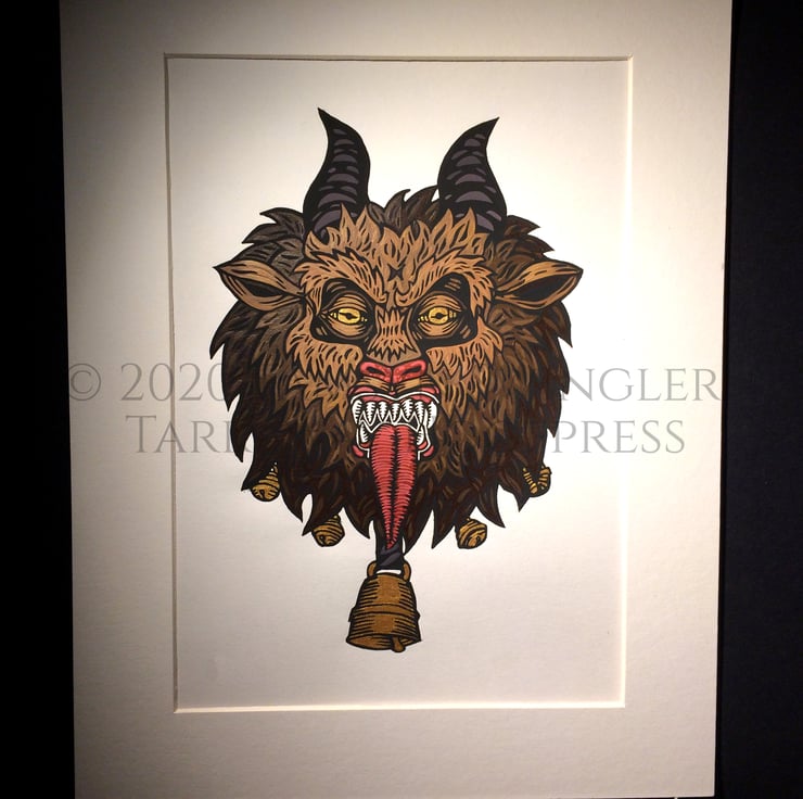 Alpine folklore brings us Krampus, the friend of St Nicholas, and whilst St Nicholas rewards the good little boys and girls at Christmas time, Krampus punishes them, either by thrashing them with branches or carrying them off in a potato sack or a basket on his back. Also available in a line monoprint version in this very shop!