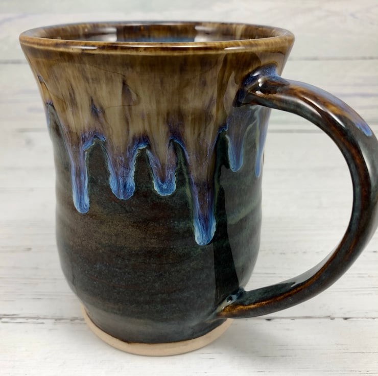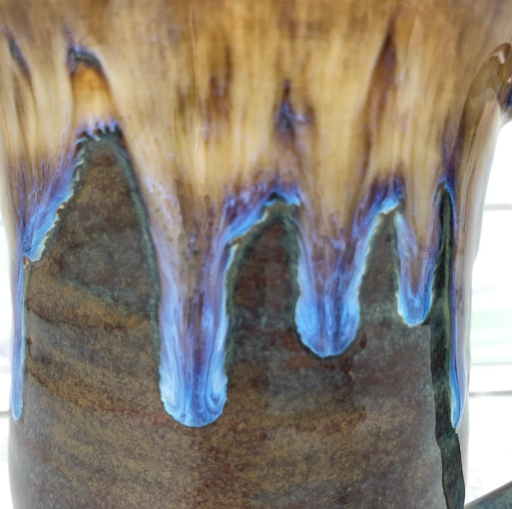 This piece was brush glazed in layers of different glazes to create the delicious drippy effect. The glazes melt into each other during the firing creating this beautiful piece.