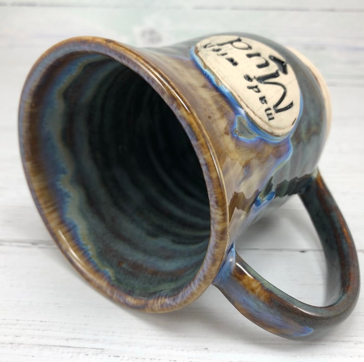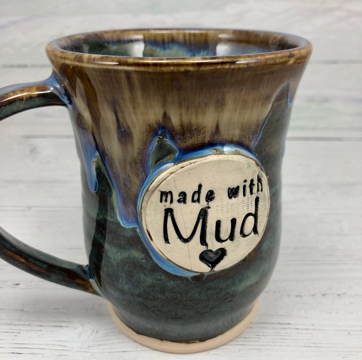 This is a wheel thrown stoneware mug featuring the Made With Mud logo.