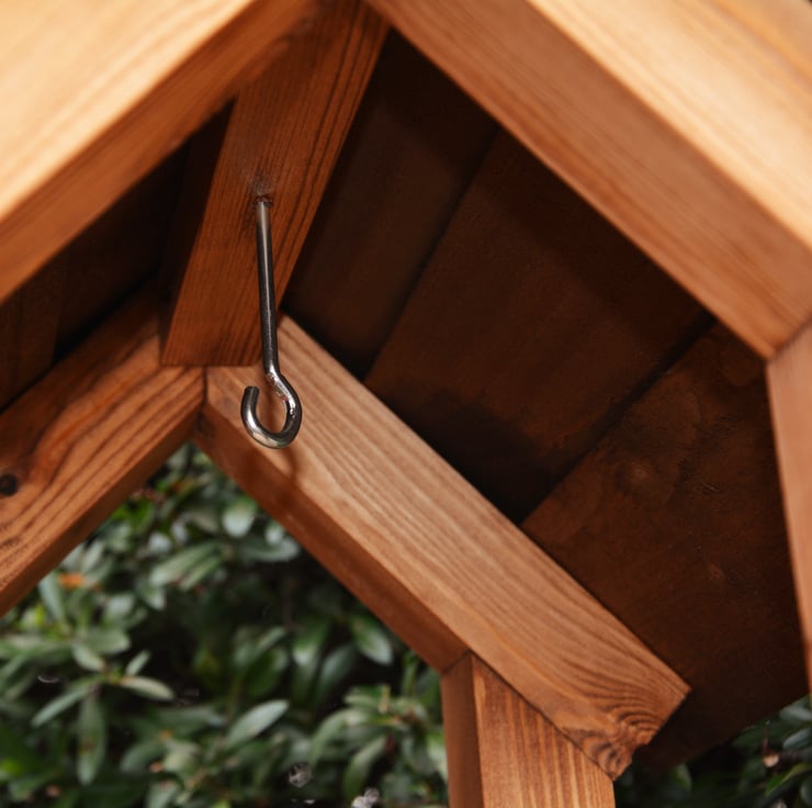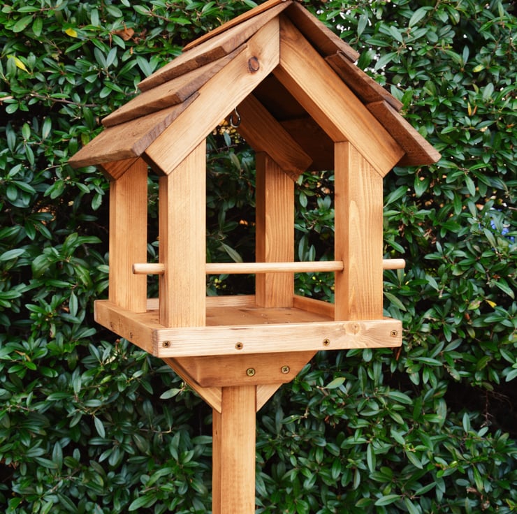 Made here in the UK, a quality handmade bird table, which we construct using only screws. The top features a practical and decorative feather edge roof, along with a sturdy perch and we have attached a strong hook to the under side of the roof. There is also a drainage hole in each corner of the tray.