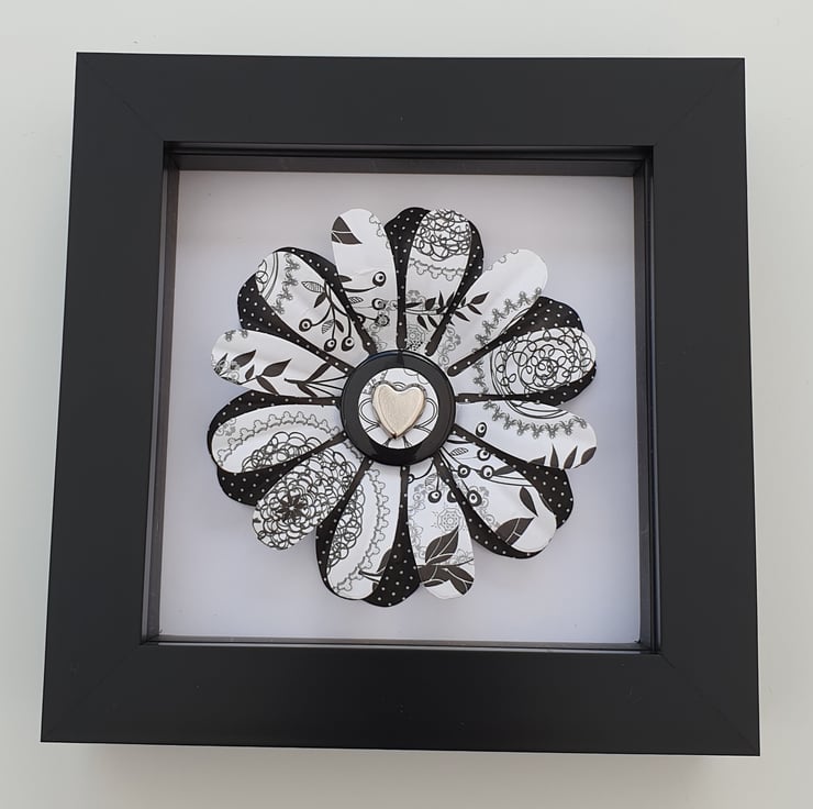 Lovely monochrome 3D flower papercrafted from pretty paper and set in a small box picture frame. A button and a metal heart have been used for the flower centre.