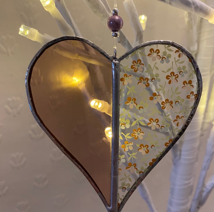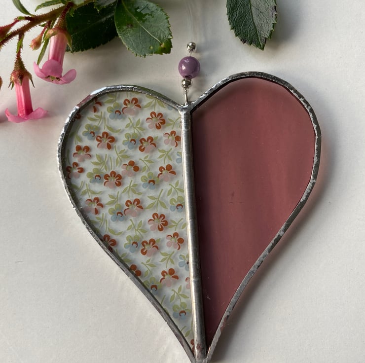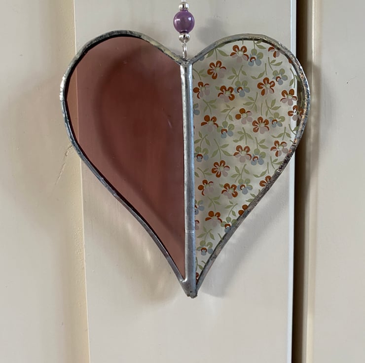 A beautiful 2 tone stained glass heart made using the Tiffany ( copper foiled ) method of stained glass . Each half is a different colour , (pale purple, clear with pink and blue flowers )