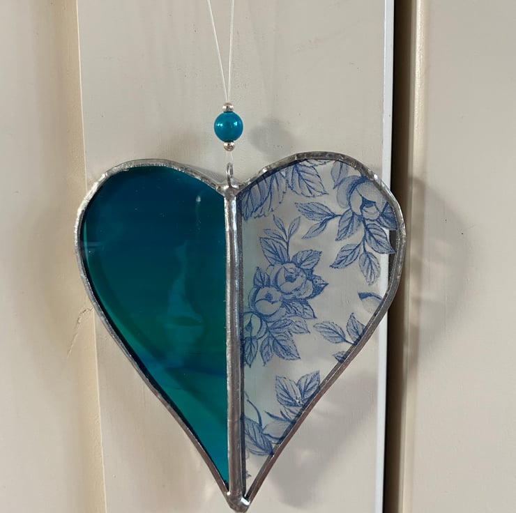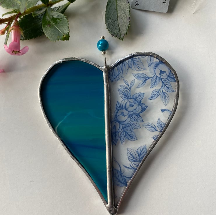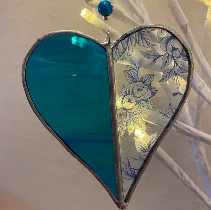 A beautiful 2 tone stained glass heart made using the Tiffany ( copper foiled ) method of stained glass . Each half is a different colour , (Turquoise,clear with blue flowers )