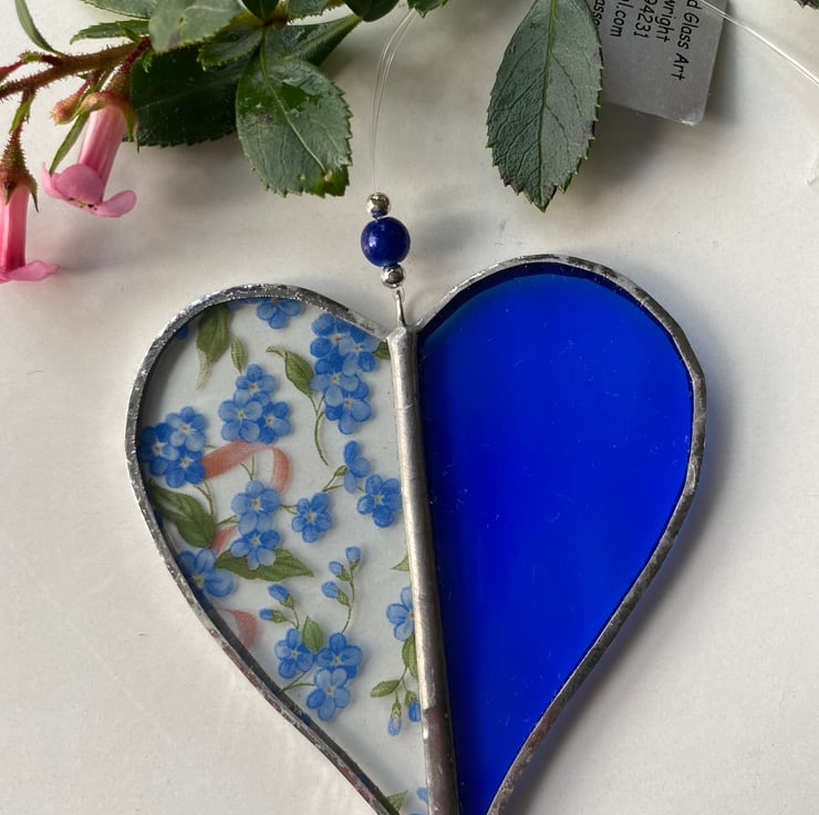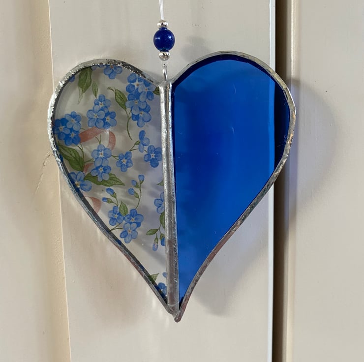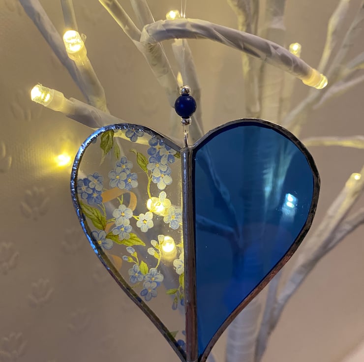 A beautiful 2 tone stained glass heart made using the Tiffany ( copper foiled ) method of stained glass . Each half is a different colour , (blue , blue forget me not flowers )