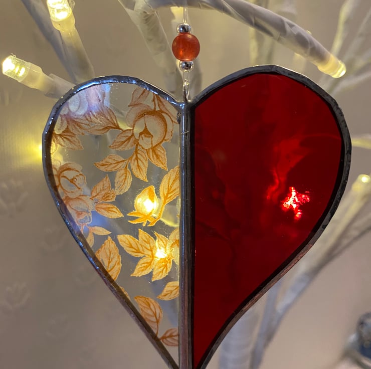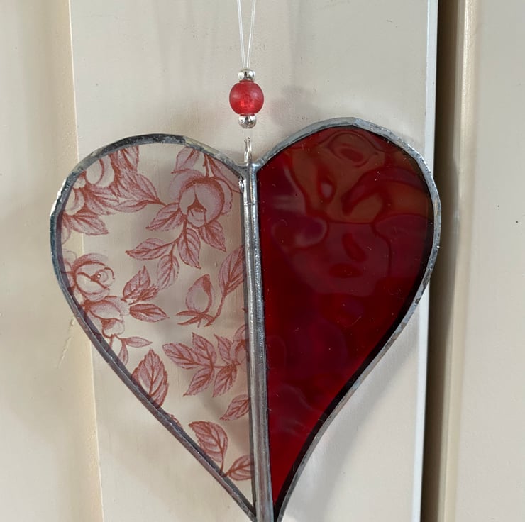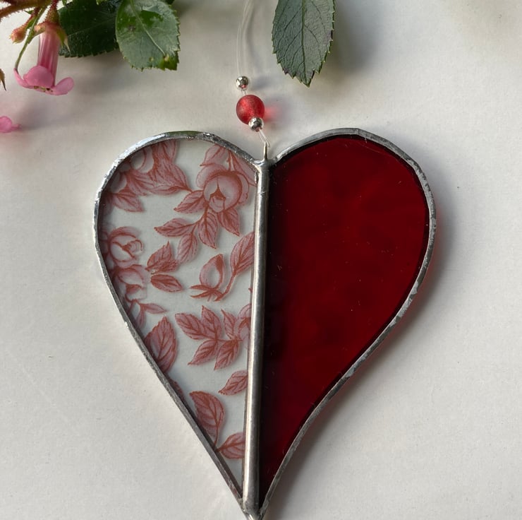 A beautiful 2 tone stained glass heart made using the Tiffany ( copper foiled ) method of stained glass . Each half is a different colour , (Red,clear with pink flowers )