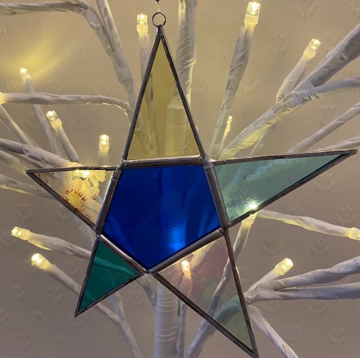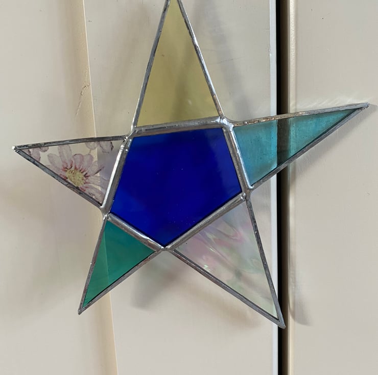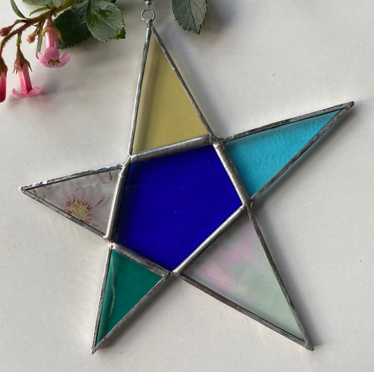 A beautiful 5 point stained glass star made using the Tiffany (copper foiled) method of stained glass. Each piece of glass is a different colour, (iridescent clear, blue, green ,yellow, pale blue and pink flowers ) and texture. It has 2 small silver coloured and a pale blue bead on the clear nylon hanging thread.
