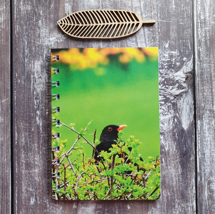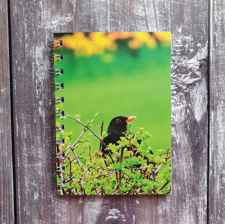 This A6 size wire bound notebook features a beautiful blackbird peeking out of a hedge.