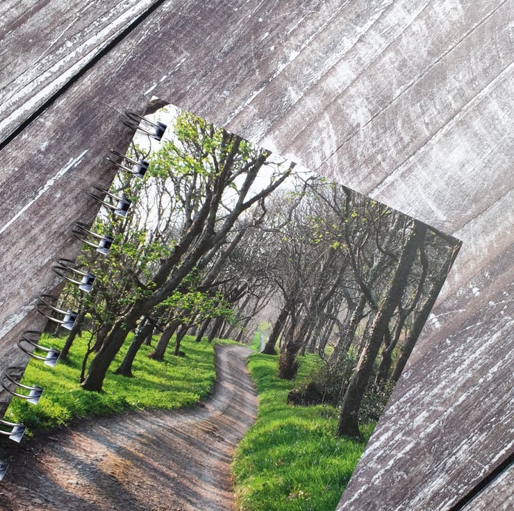 Woodland Path A6 Notebook - This is a hand wire bound A6 size notebook featuring a photograph by Becky Woolley - Daffodowndilly.