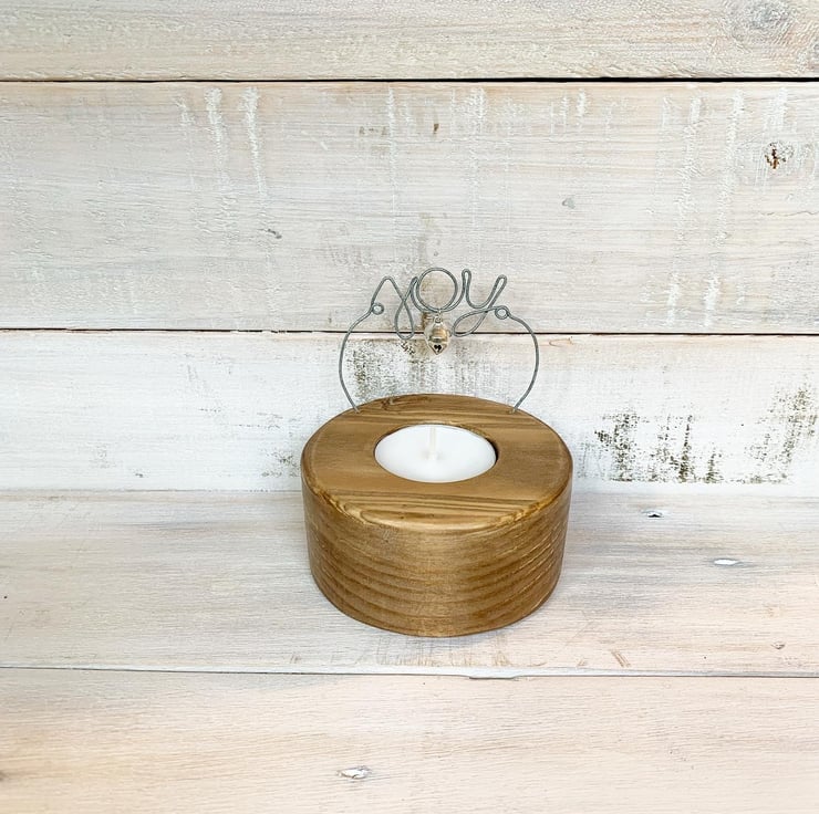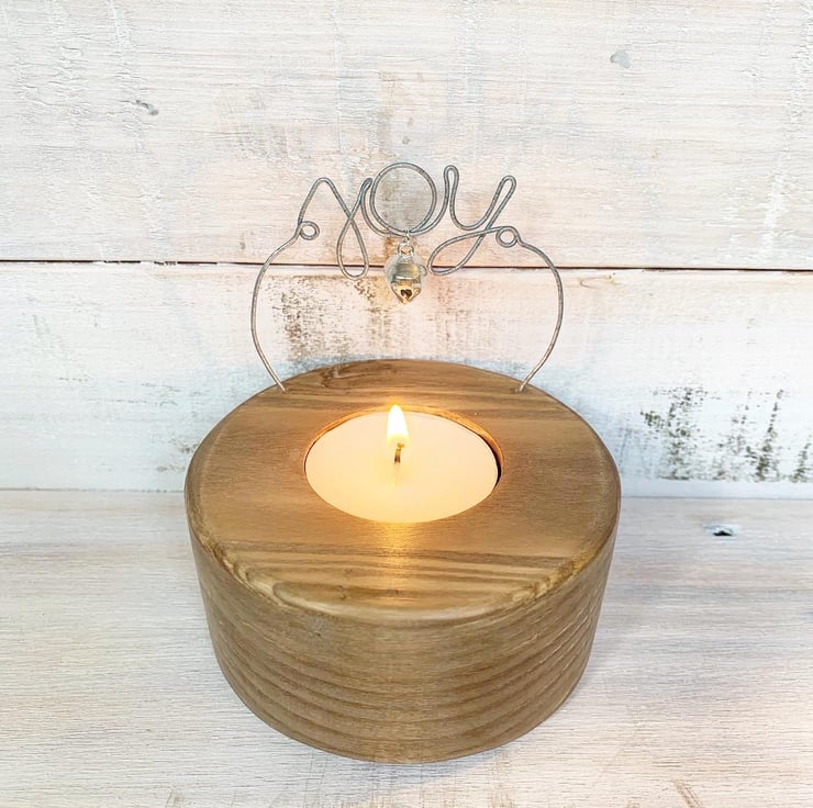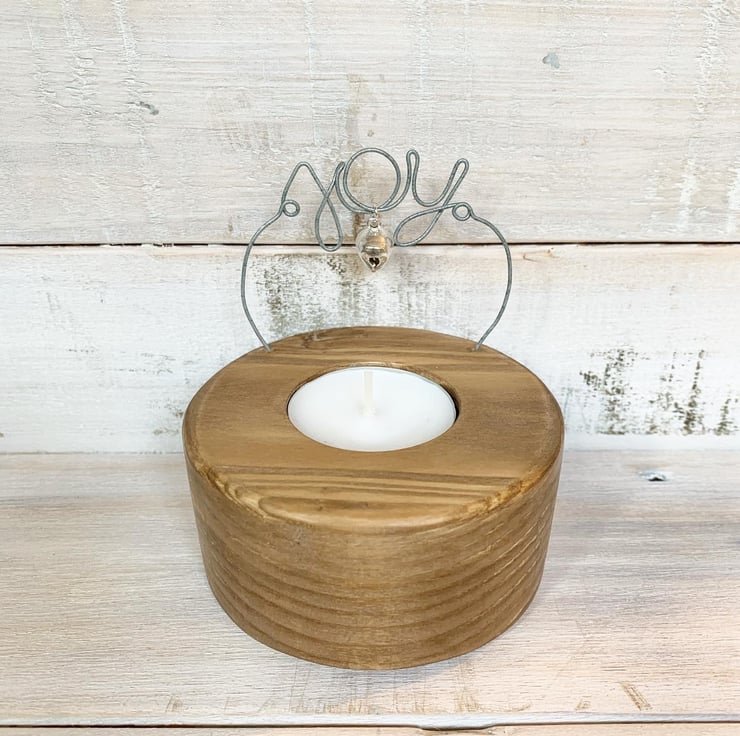 Crafted by hand from reclaimed wood with wire word ‘Joy’ and a little bell charm