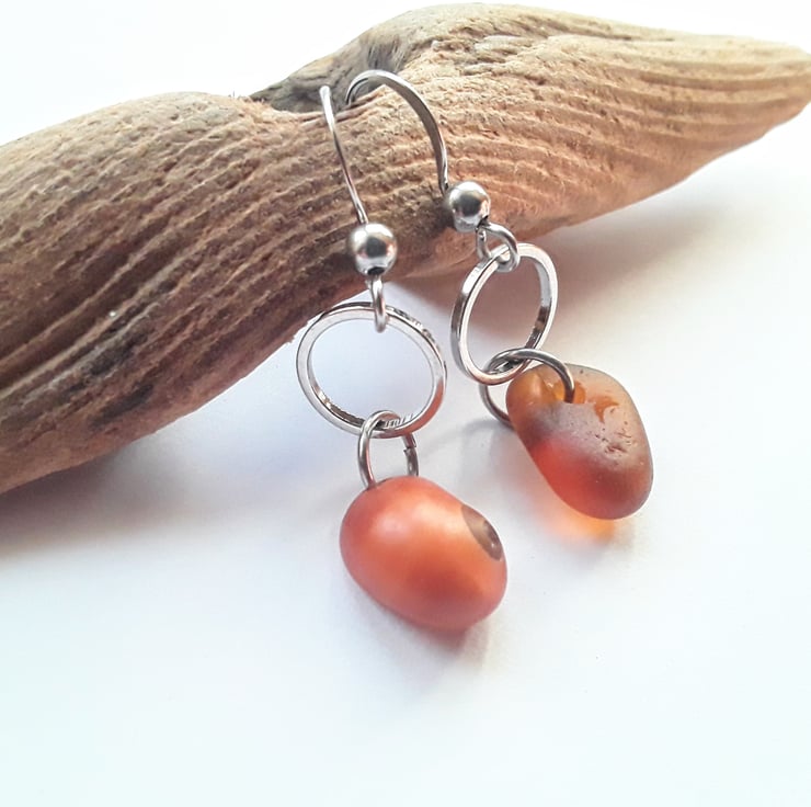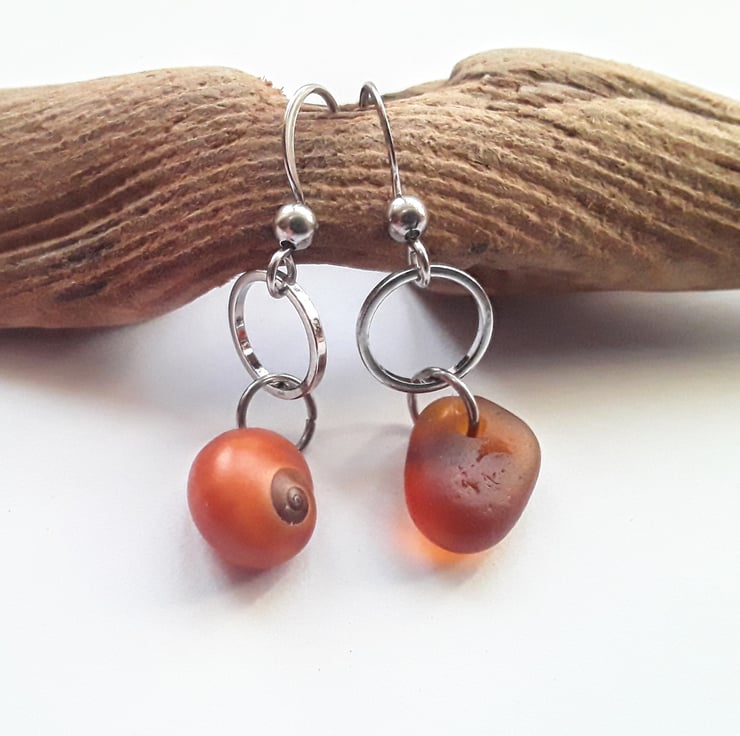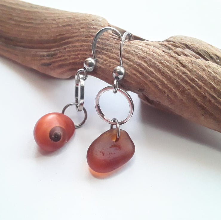 One earring has a small, dark orange, cinnamon colour periwinkle shell, the other earring has a smooth, beautifully sea-worn, dark orange, cinnamon colour piece of seaglass. (I always wonder what it once was?!)