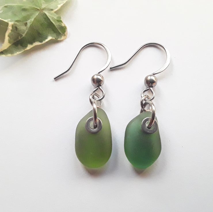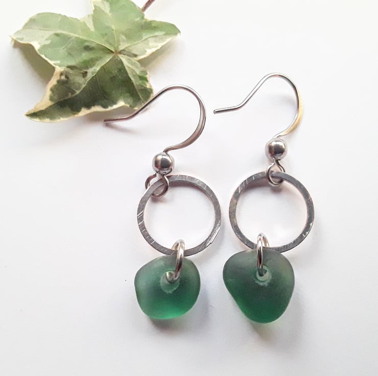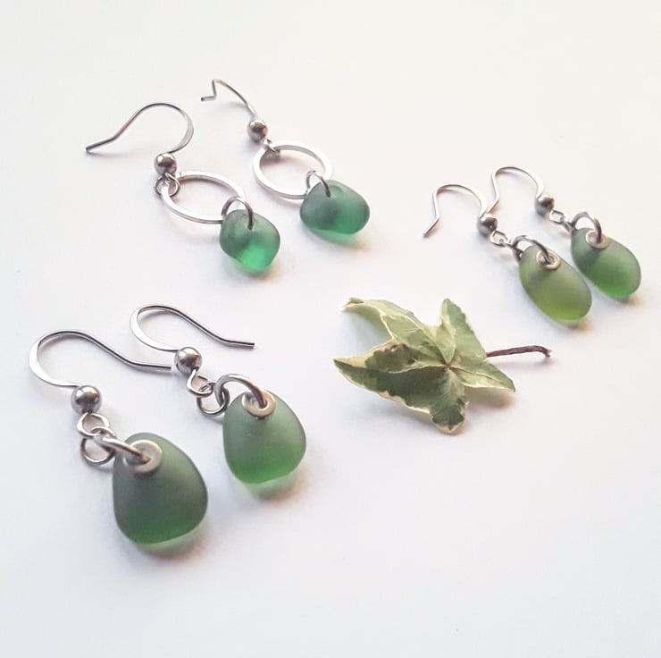 These little nuggets of perfectly sea-worn seaglass I collected from Seaham in Durham have been hand-drilled to create three pairs of simple green seaglass earrings. I've added the tiniest stainless steel washers, or 1cm diameter stainless steel circles for added detail.