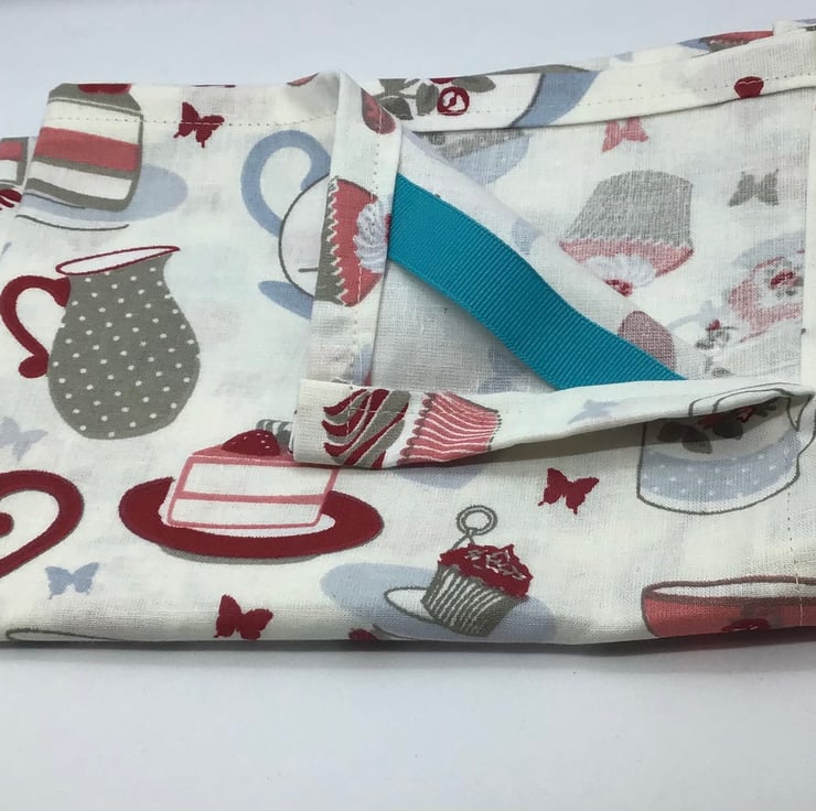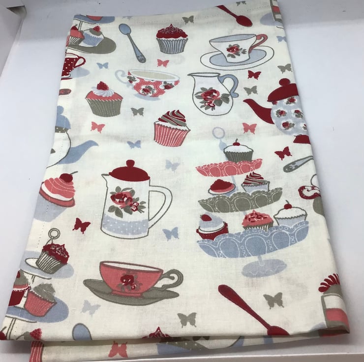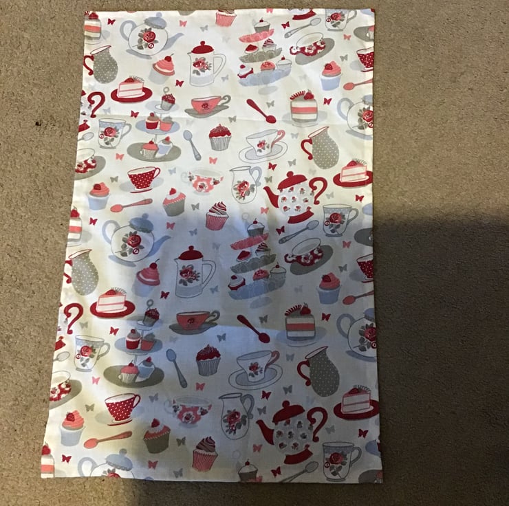 A hand made tea towel featuring teapots and cups. Measures approximately 28” by 18”. Hanging loop on one corner. 100% cotton. Made in Lancashire.