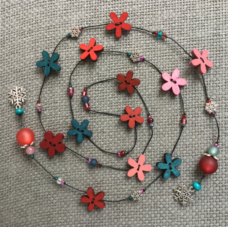 Lariat necklace featuring a glorious mixture of beads and wooden flowers in shades of teal, pink and berry red. The beads include painted wood flowers, glass, Polaris and wooden beads, mixed in with antique silver tone snowflake beads and charms, all strung on a waxed linen thread.