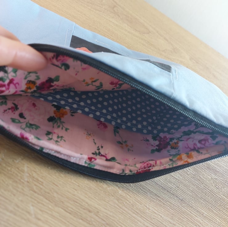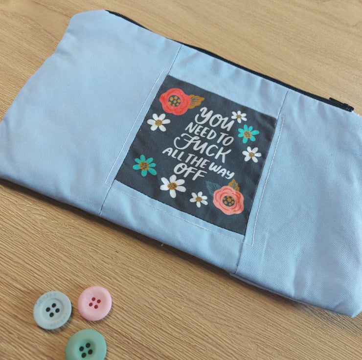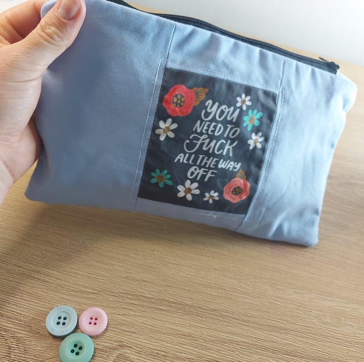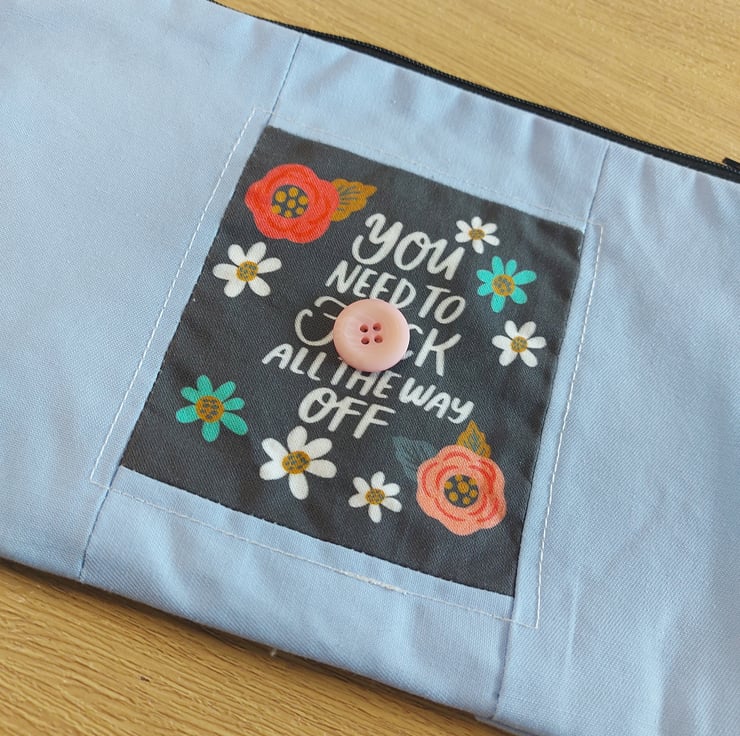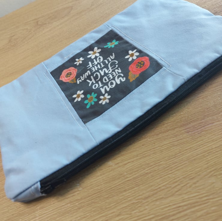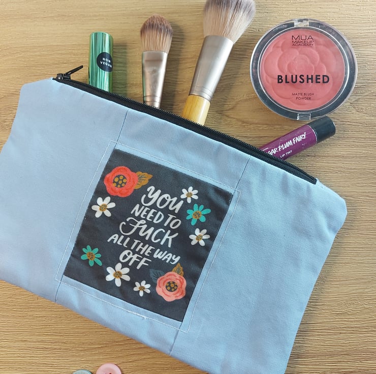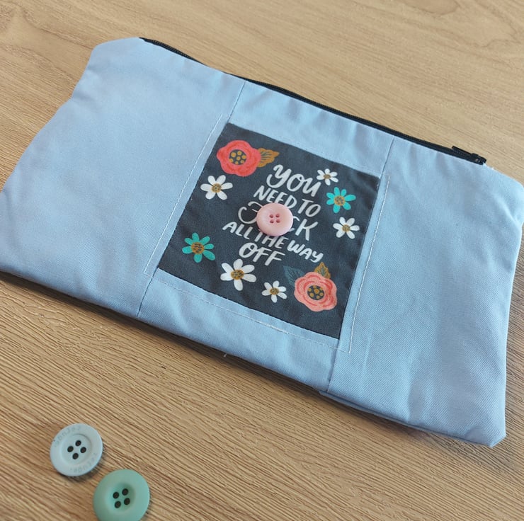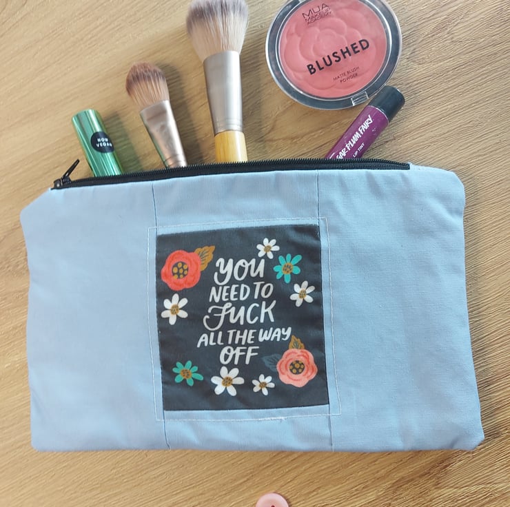 This is a hand made one of a kind make up bag or pencil case users choice , in a beautiful light blue cotton drill . The lining is a dusky pink with a floral print and blue polka dot divider . The real feature of this range is the panel on the centre front of the bag this one reads '' you need to f-ck all the way off '' surrounded by wild flowers . This hole collection is a little bit cheeky but all beautifully don there are no repeats in this collection so every bag is a one off they are all also roughly 10 by 6 inches with a 9 inch zip .