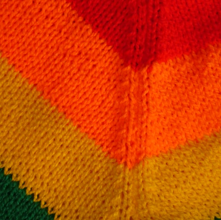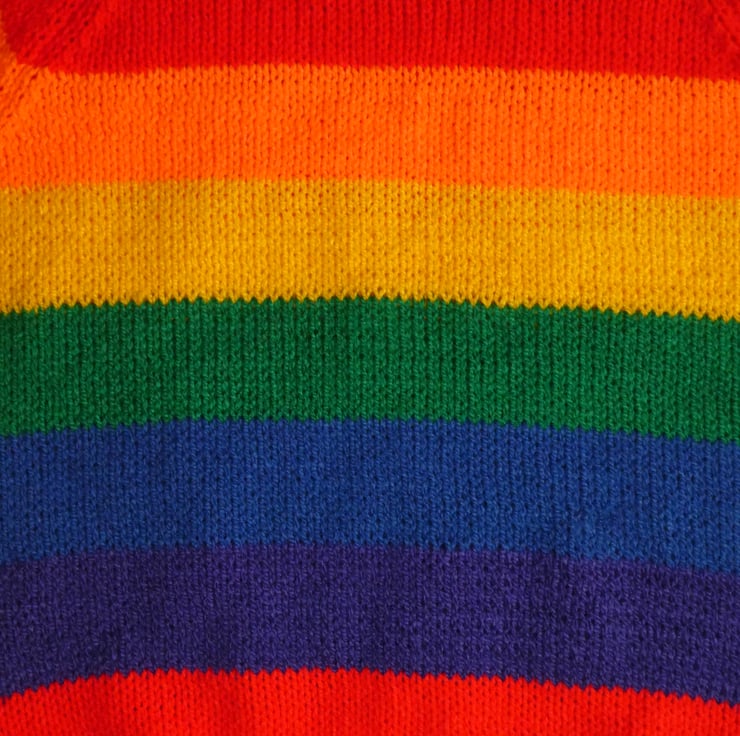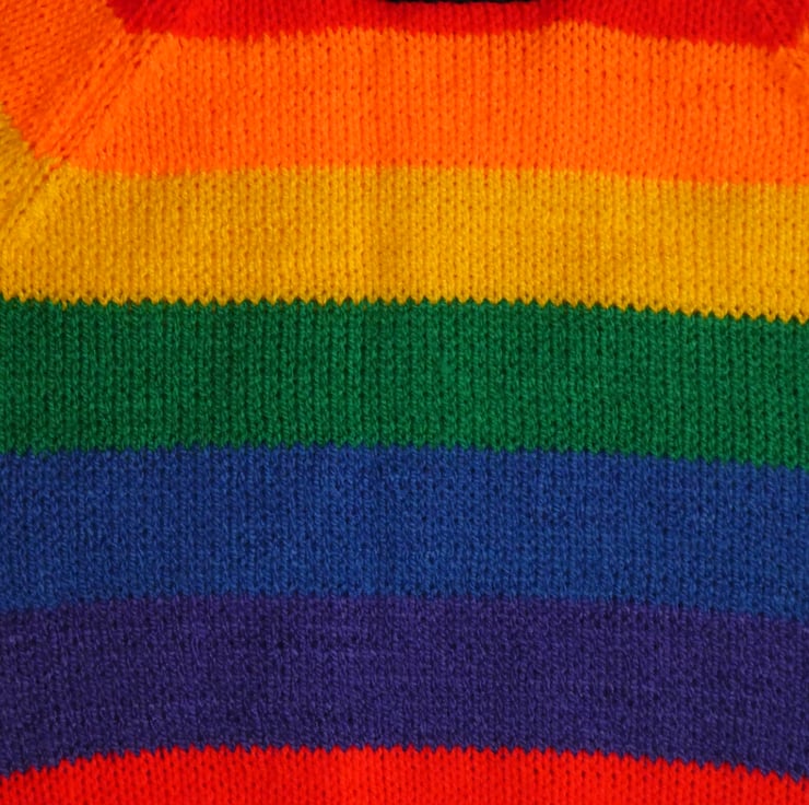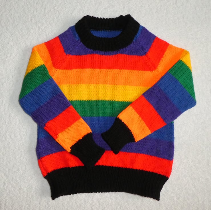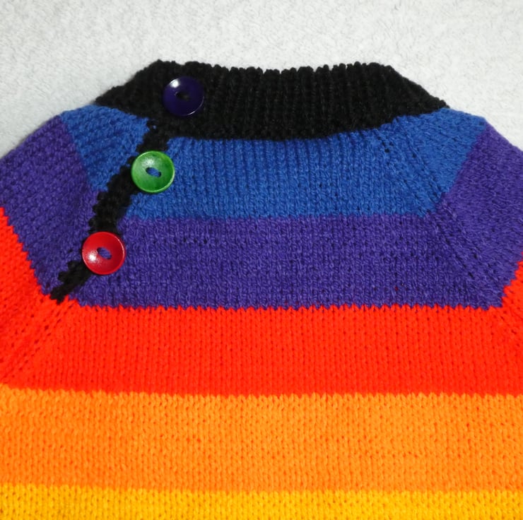 This fabulous jumper has been created on a double bed knitting machine, from acrylic 4ply yarns. There are ribbed cuffs and hem, with a folded rib neckband. There is a 3 button neck closure on the back raglan seam. The main body of the jumper is in stocking stitch, and has raglan sleeves, so the rainbow stripes match across the body and sleeves. Each rainbow stripe is approximately 1.25" wide. The jumper has been finished by hand sewing the seams, crochet edged on the neck opening, and wooden buttons added.