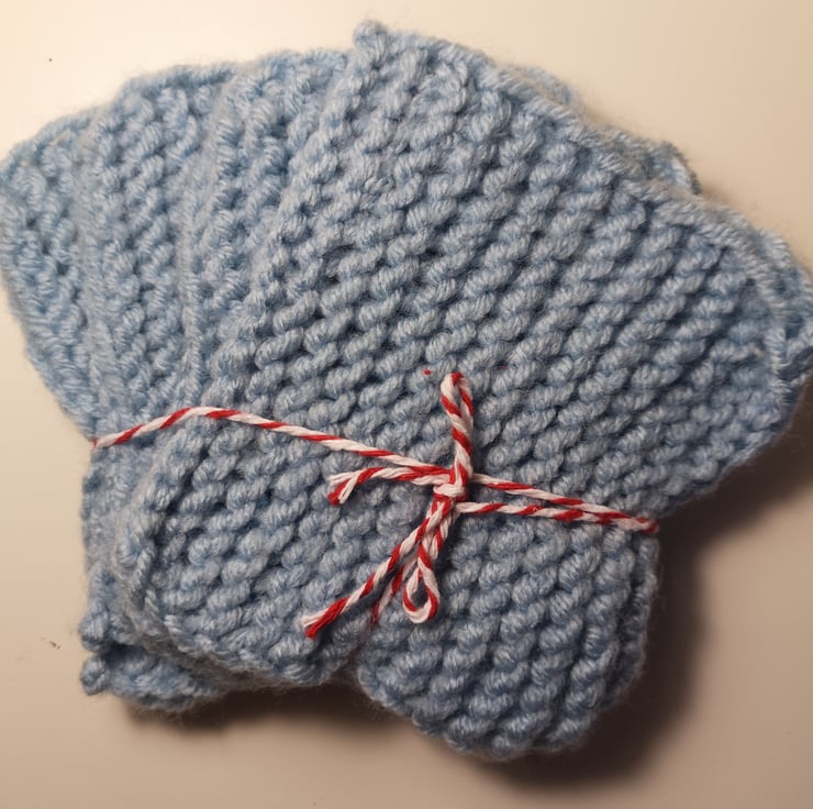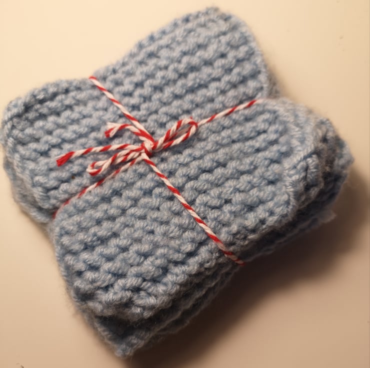 A set of four matching coasters in a light blue 100% acrylic yarn. They are machine washable to remove any spills