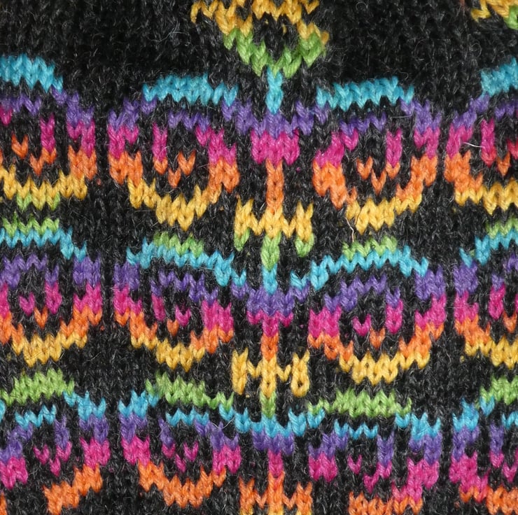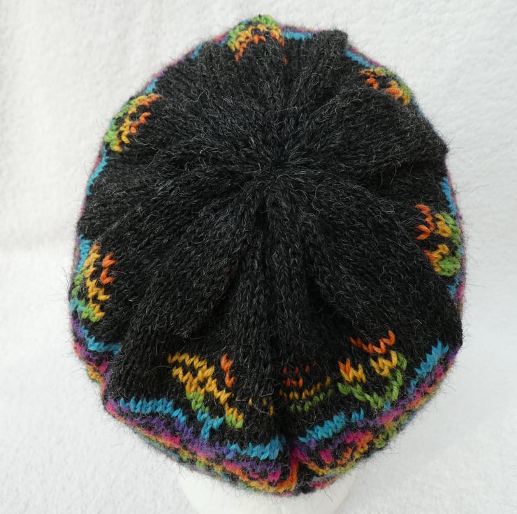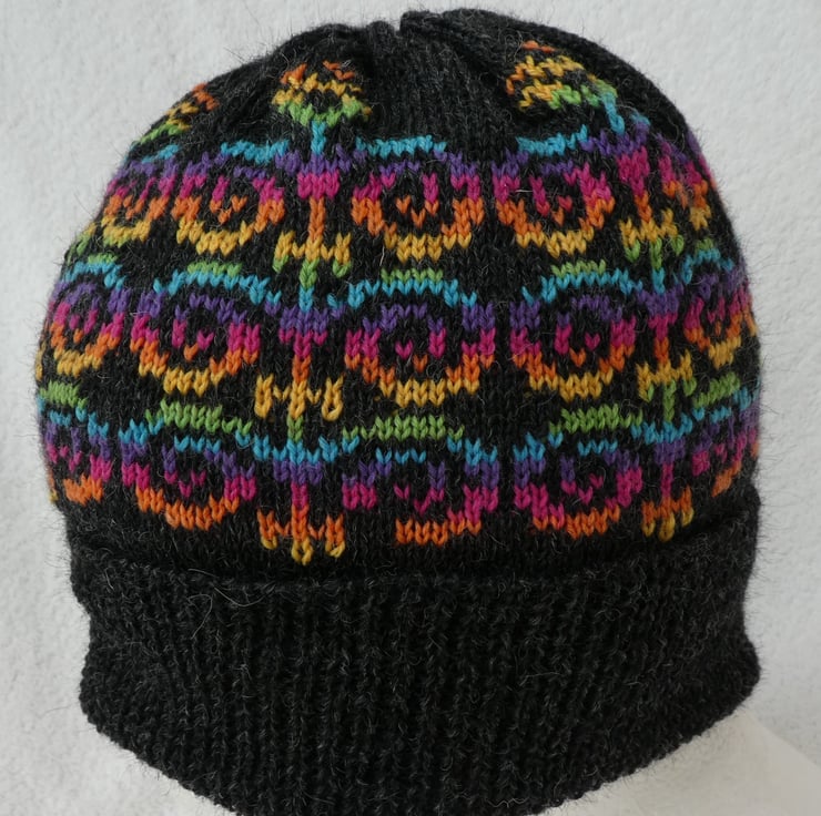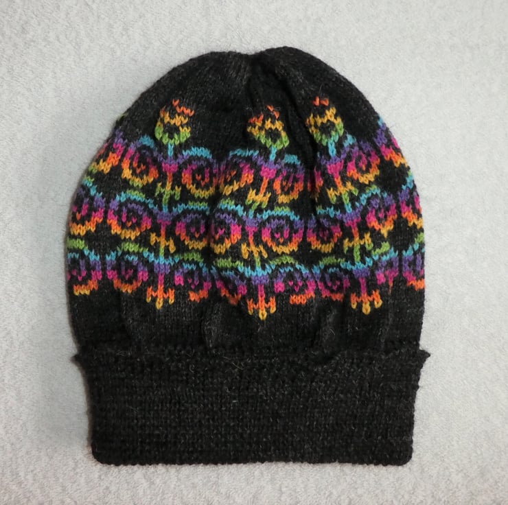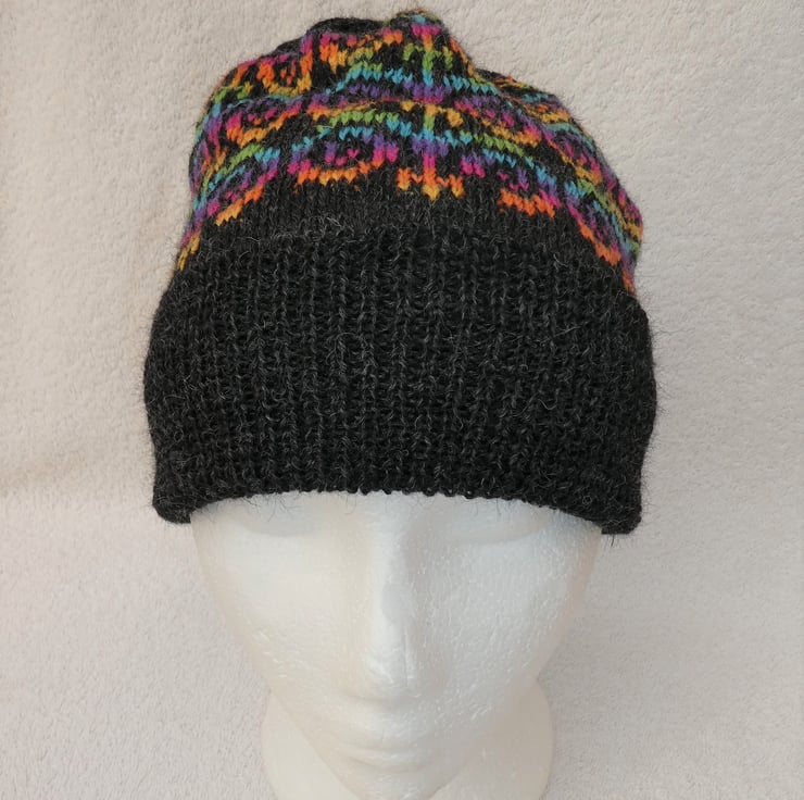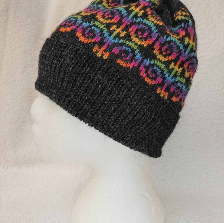 I have created this lovely warm hat on a knitting machine. There is a deep 1x1 rib, and a fair isle rainbow design. The background dark grey yarn is pure wool, and the rainbow is a wool and nylon sock yarn. This hat has been knitted flat, and finished by hand sewing the back seam and gathered at the top.