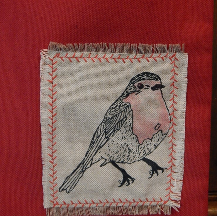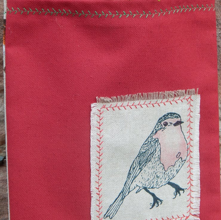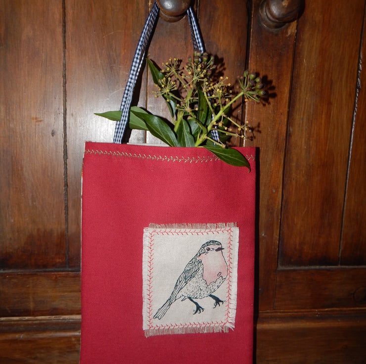 This is a small, light use canvas bag. It measures 29 cm in length by 19cm wide. There is a Robin that has been screen printed on beige cotton, this has been appliqued onto the front of the bag. On the back of the bag is a beige fabric with small robins.