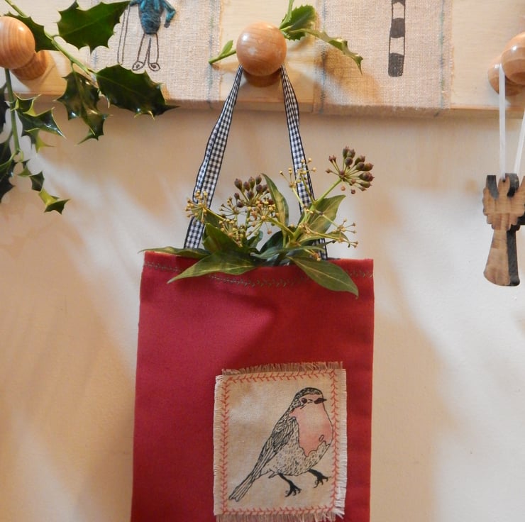 The bag is unlined and has simple black and white ribbon handles. It would be ideal to keep craft items in, wool or be a gift bag to a loved one. Lovely to hang in the house on furniture handles/knobs, bed frame, notice board or hangers. Would make a lovely Christmas gift bag to give to a loved one filled with wrapped goodies.