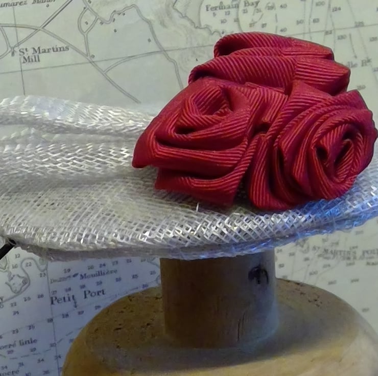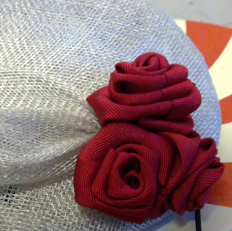 I love making ribbon roses & wanted to make a simple but effective fascinator to show them off. I think this little silver sinamay umber does just that.