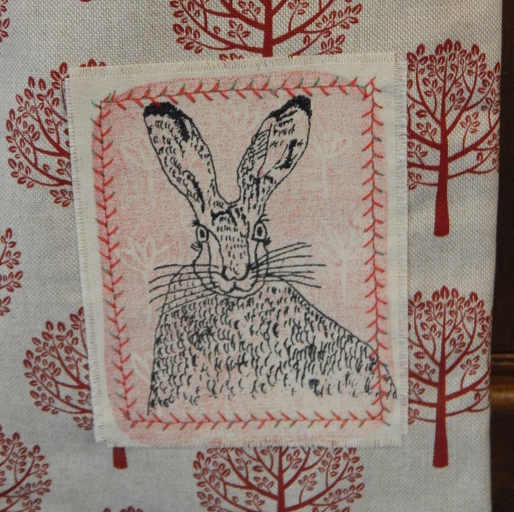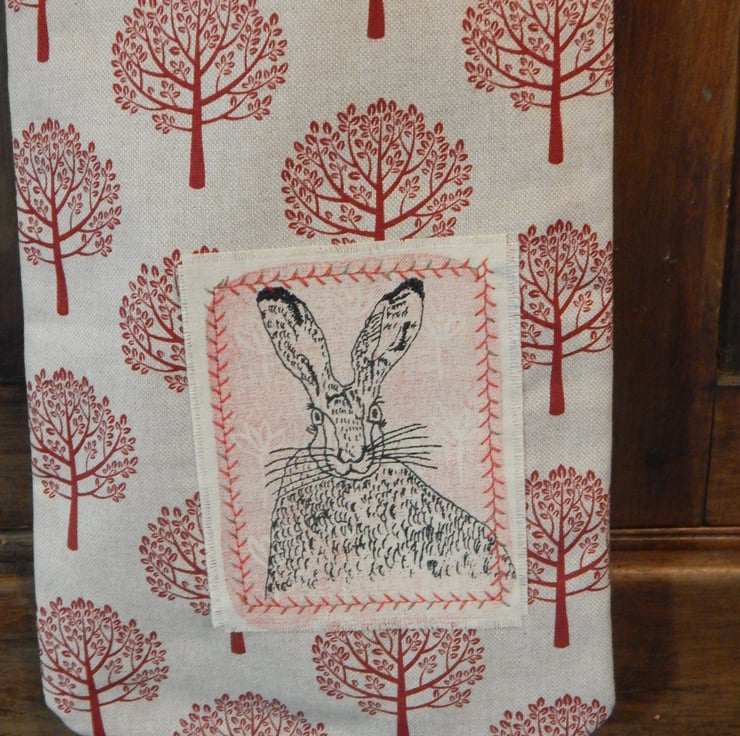 This is a small, light use canvas bag. It measures 28 cm in length by 19cm wide. There is a Hare that has been screen printed on beige cotton, with a simple red lino print, this has been appliqued onto the front of the bag. On the back of the bag is a beige fabric with the same red tree pattern as the front.