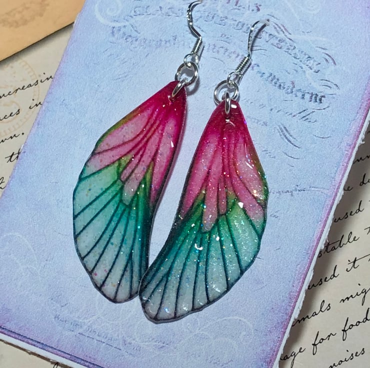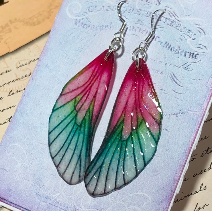Pink and green fairy wing earrings.