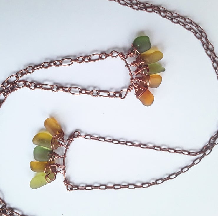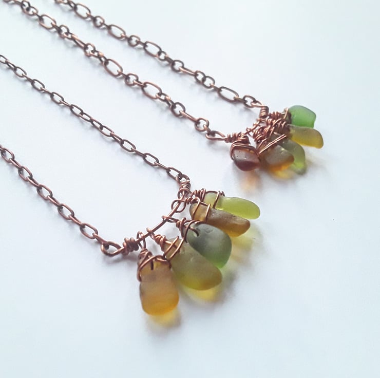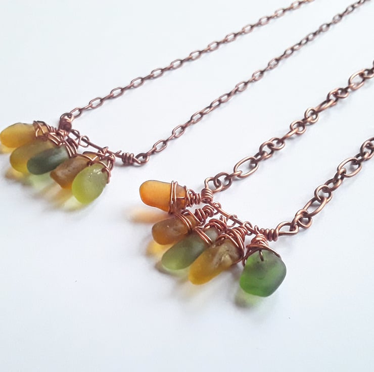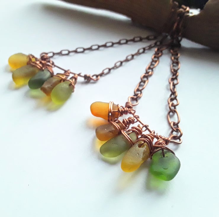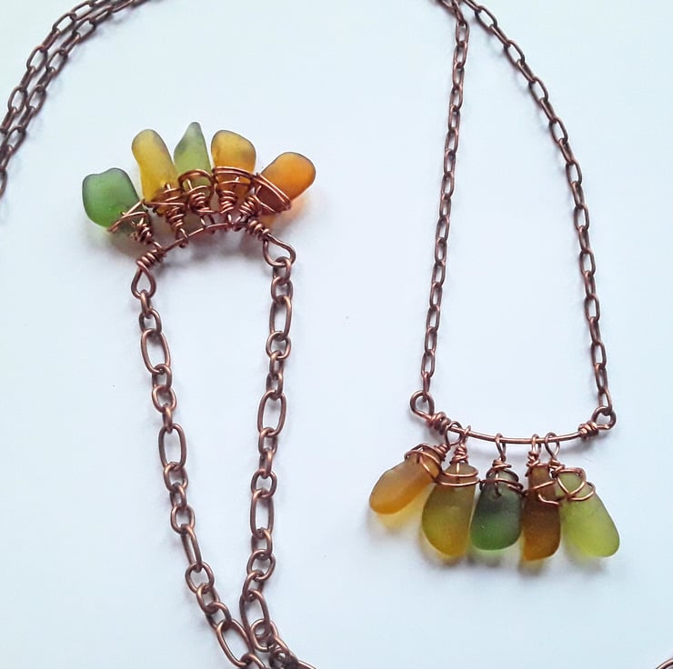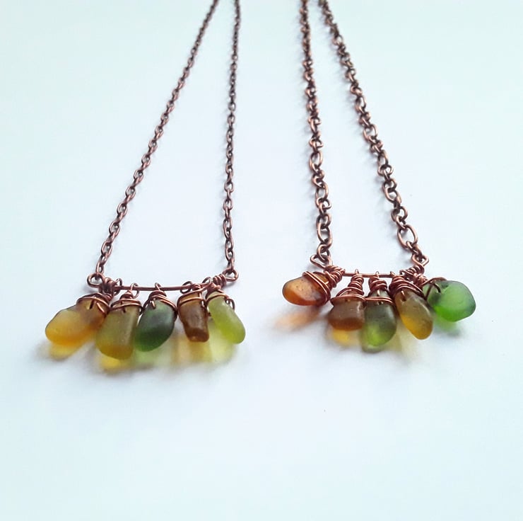 Five little nuggets of golden yellow, leaf green, soft and dark orange seaglass have been hand-drilled and wrapped with fine copper wire.
