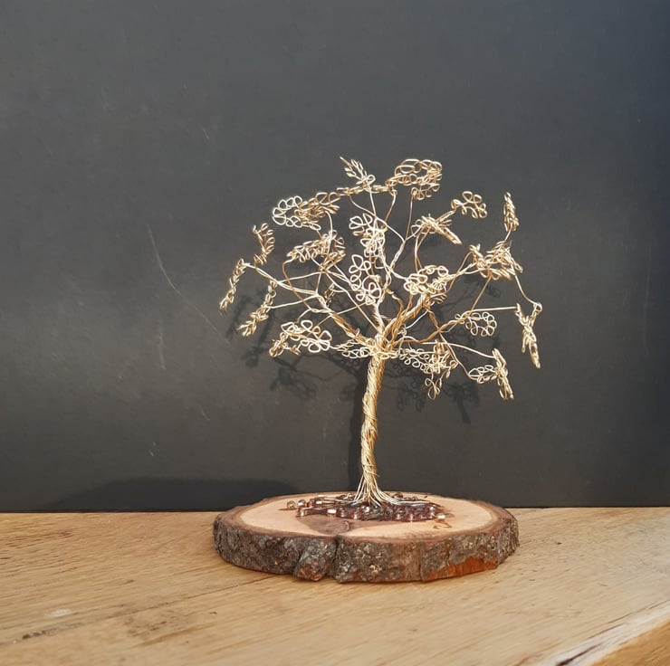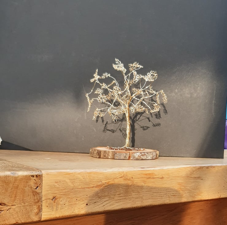 I have twisted and looped wire to sculp a tree set on a wooden base the wood is recycled from my garden height of tree 13 cm width of wooden base 10 cm. A lovely gift
