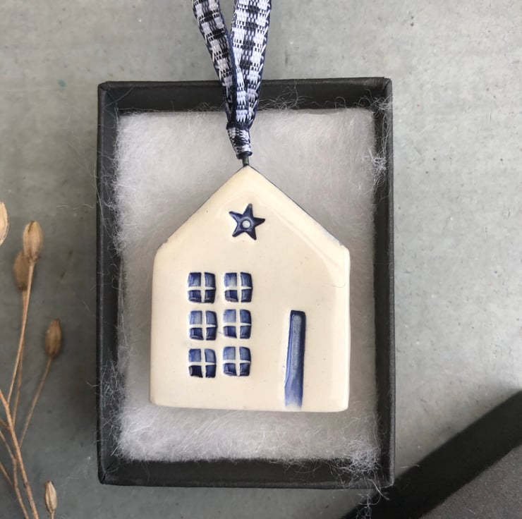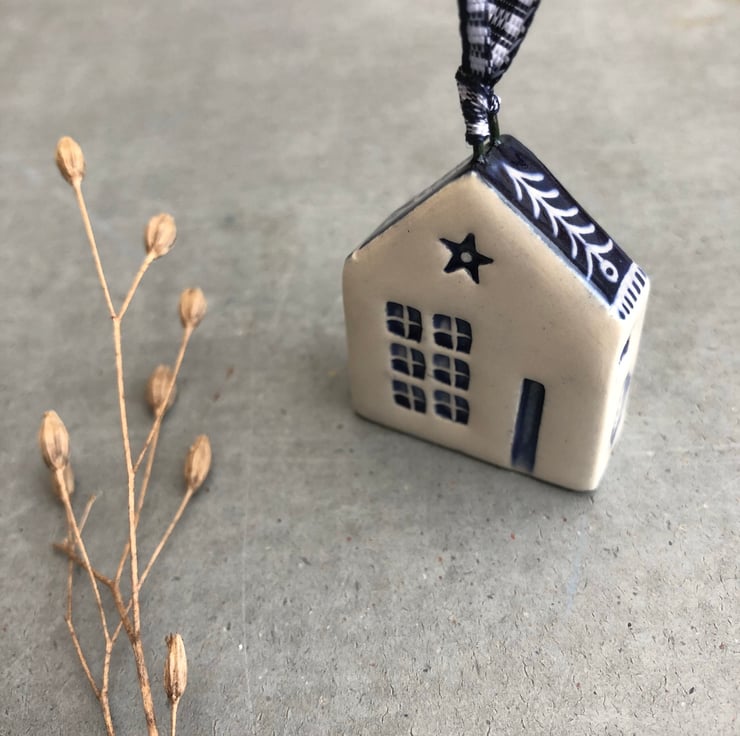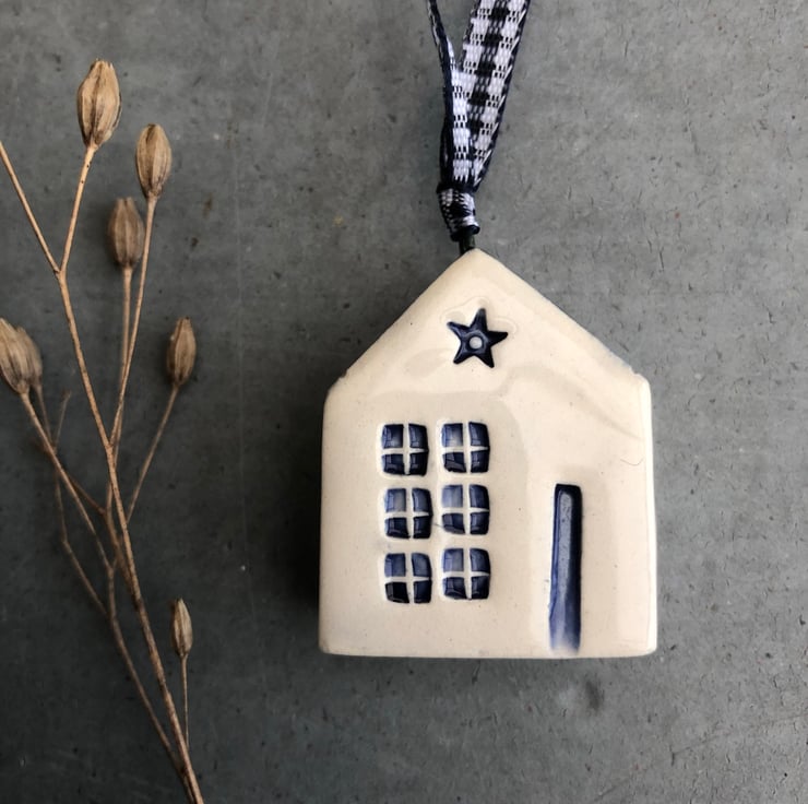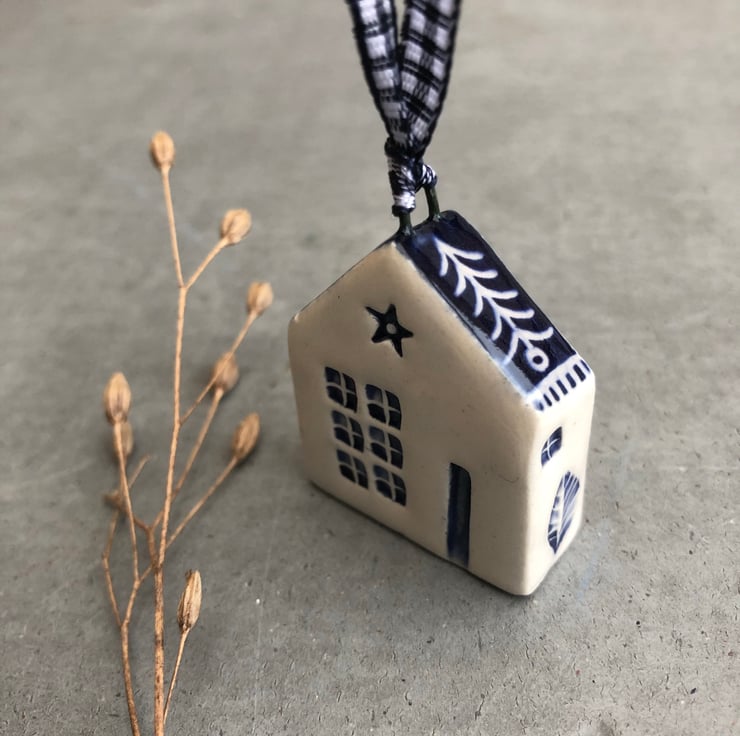 Each decoration is hand made from white earthenware clay, decorated with coloured slips and a hand drawn scraffito design. Decoration has also been added using my own handmade clay stamps and underglaze colours .Gingham ribbon is attached to allow the decoration to be hung.