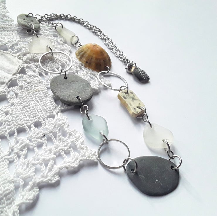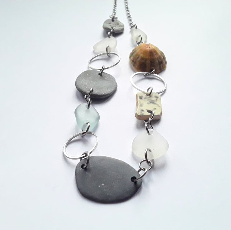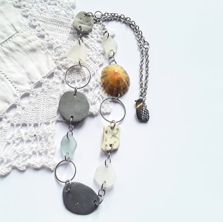 In mainly neutral and greys with a hint of apricot, I've used limpet shell, Cornish beach-slate, frosty white and rare lavender seaglass, oyster shell, and a piece of softly patterned sea pottery (could have been from a china teacup? Discarded by a shamefully decadent picnic goer?) The clasp has a small shell fragment, because I love attention to detail.