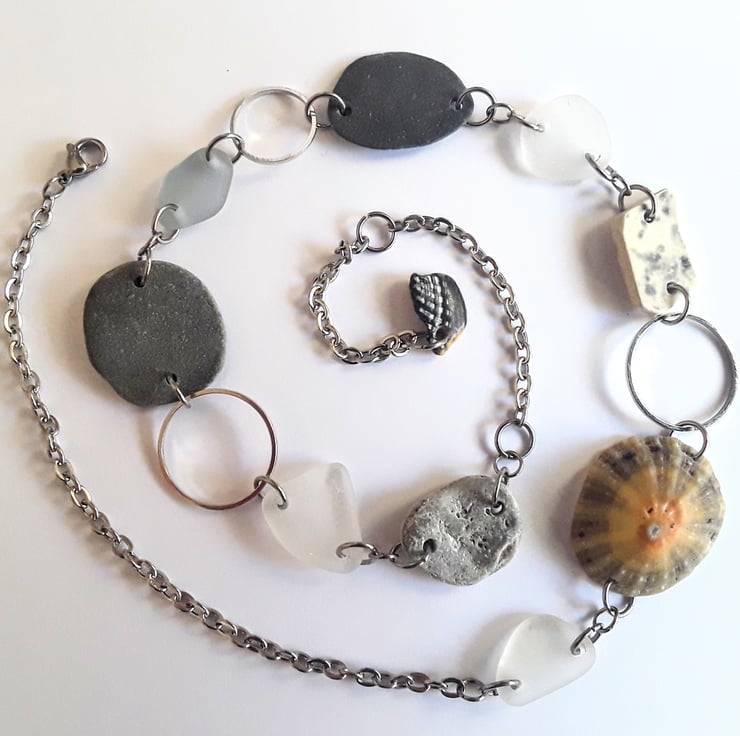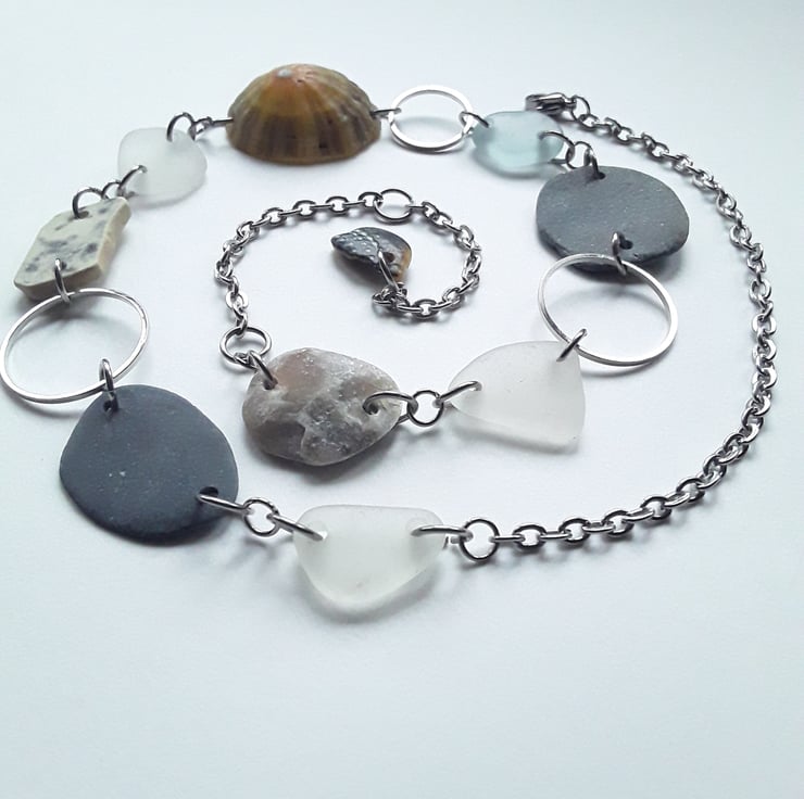 A beautifully random selection of beachcombed finds, have been hand-drilled and made into a fully adjustable chain of loveliness.