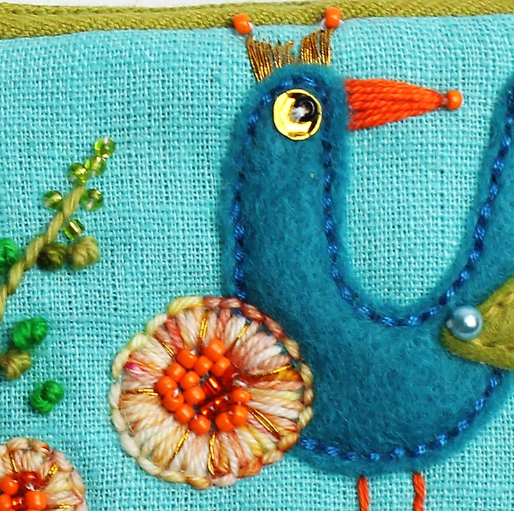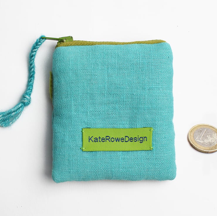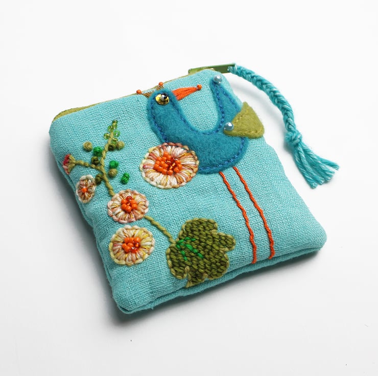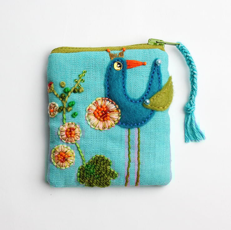 This little coin purse (3" by 3"/7.5cm by 7.5cm) has been made in turquoise linen fabric and hand appliquéd with a bird and embroidered with a hollyhock. The purse is wadded and fully lined and has a green zip and a turquoise wool plaited zip pull.