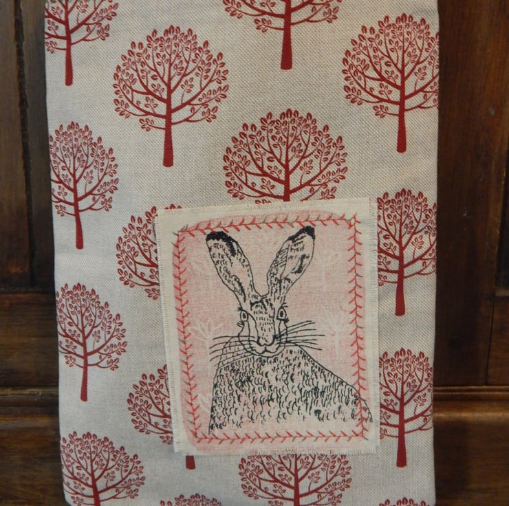 This is a small, light use canvas bag. It measures 28 cm in length by 19cm wide. There is a Hare that has been screen printed on beige cotton, with a simple red lino print, this has been appliqued onto the front of the bag. On the back of the bag is a beige fabric with the same red tree pattern as the front.