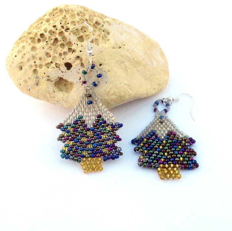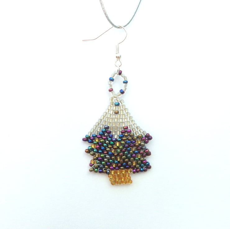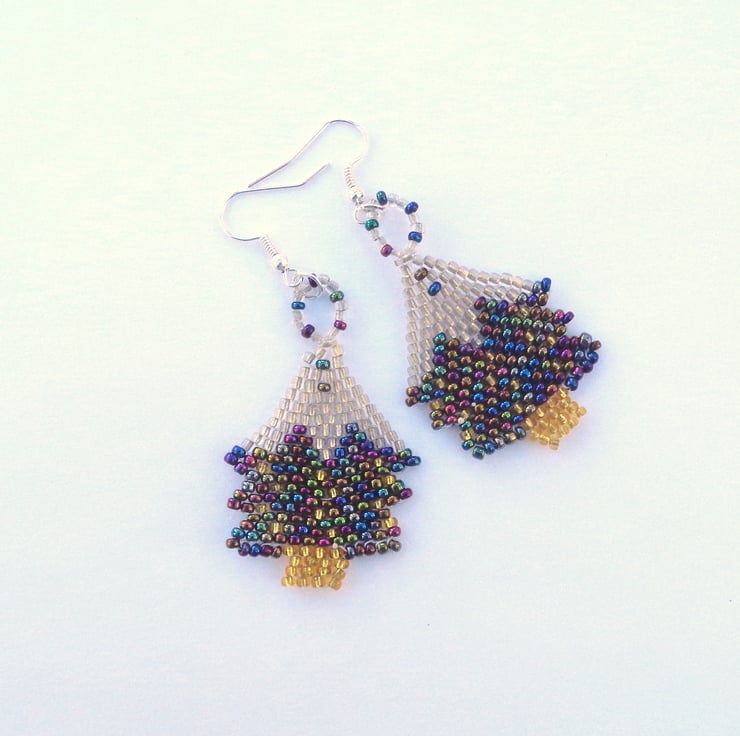 Unusual beaded Christmas trees suspended from silver plated hooks to form these fancy Christmas party earrings