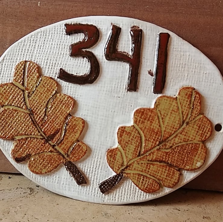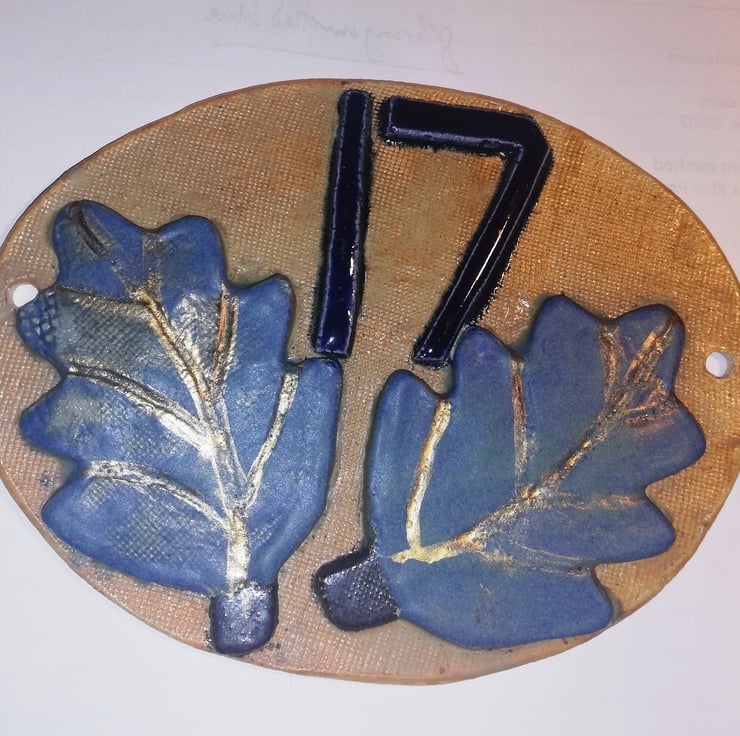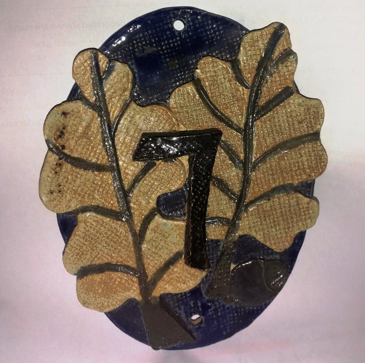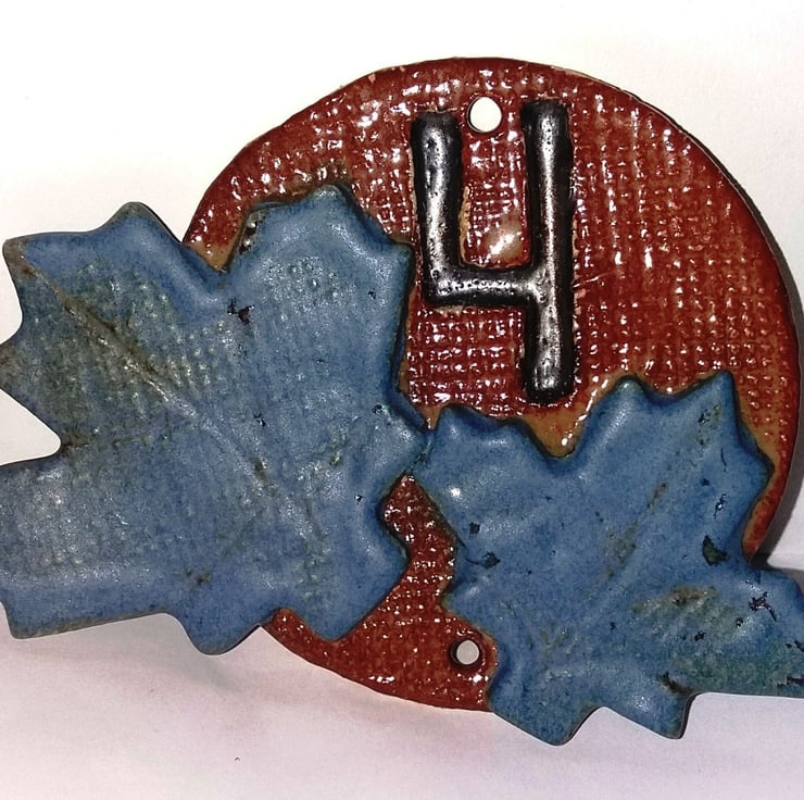 HS7 NUMBER 4 A round shaped sign with 2 matte blue maple leaf decorations and a 4 incised into the clay.