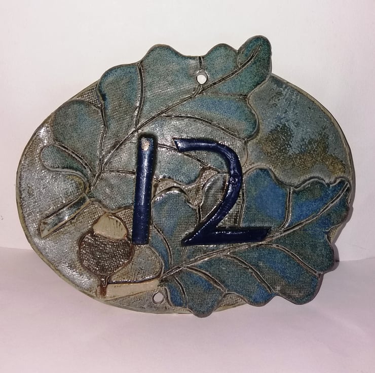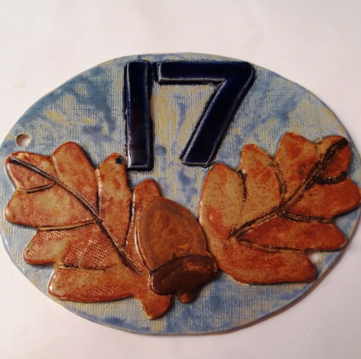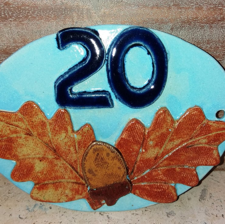 HS1 a and b: NUMBER 20: 2 x sky-blue background oval house number with 2 oak leaf and acorn decoration, 2 holes at either side.