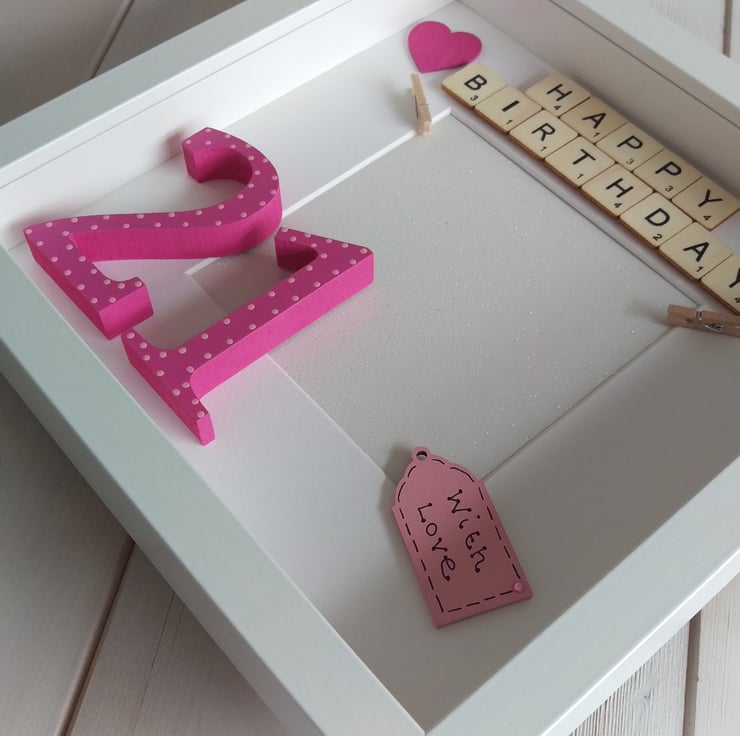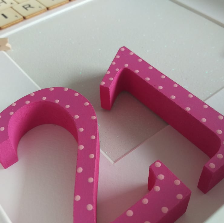 The wooden numbers are individually painted. Happy Birthday is spelt out in Scrabble letters.