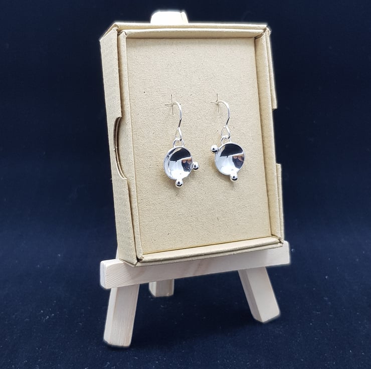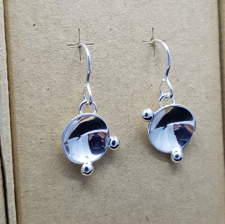 These fab dangle-drop earrings are part of my 'Planet & Moon' inspired collection. They feature concaved dome 'planets' each with two mini ball 'moons'. They have been handcrafted in sterling silver, and are one of my original designs. Wear during the day or dressed up at night.