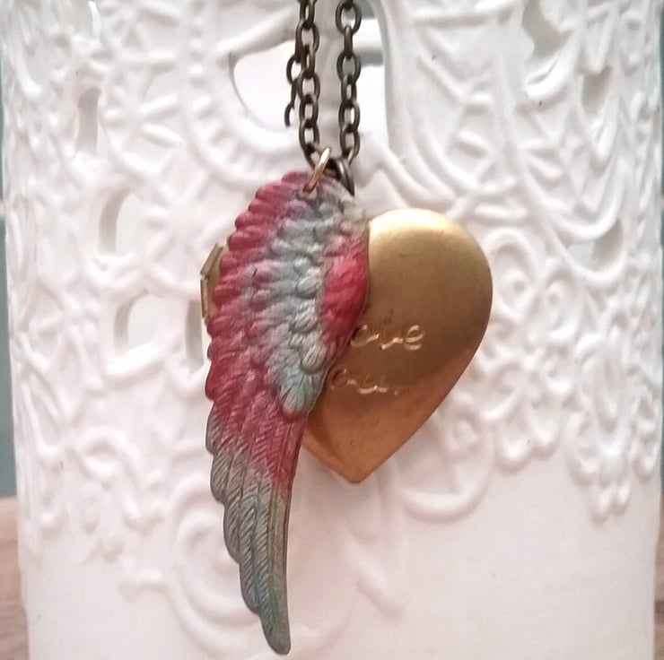 Raw brass heart locket message says I LOVE YOU and professionally hand painted wing.