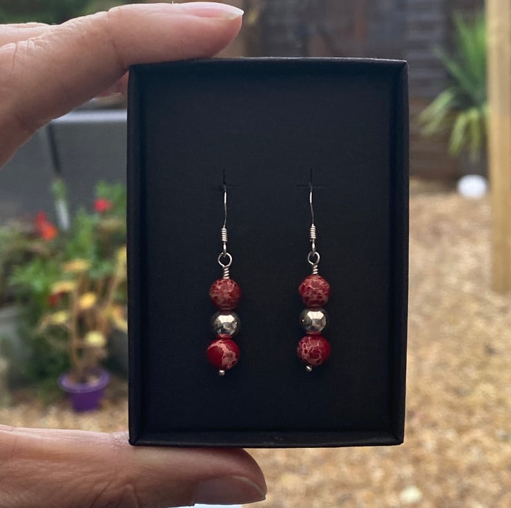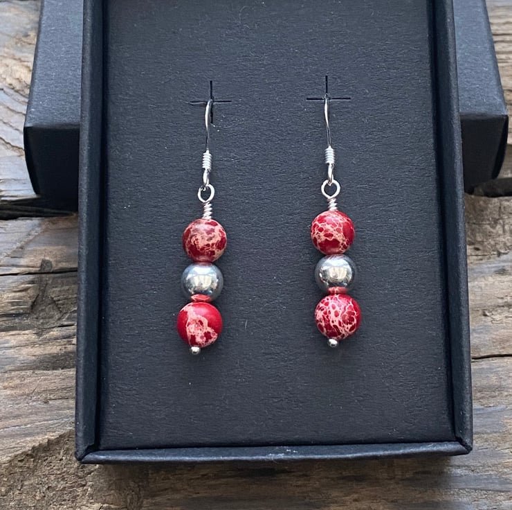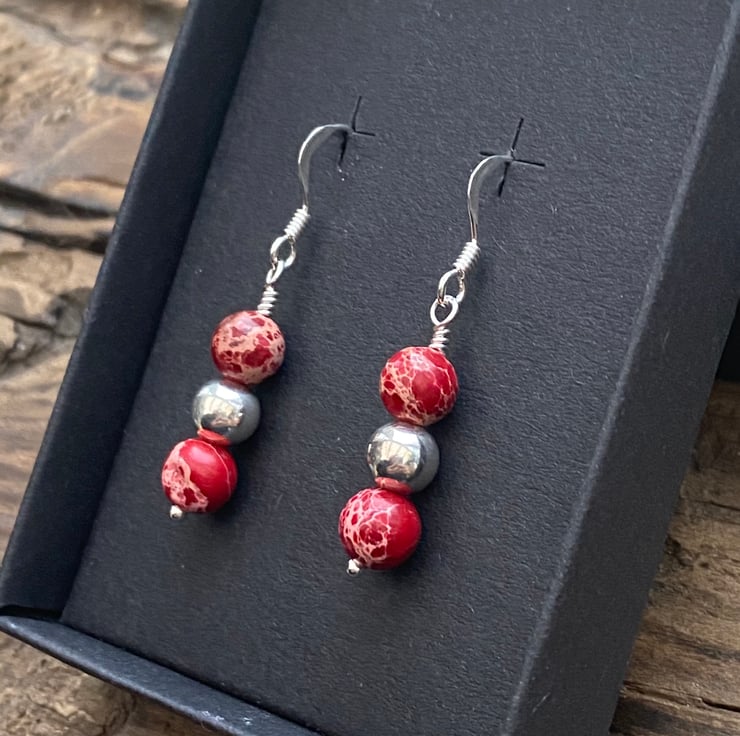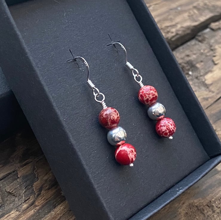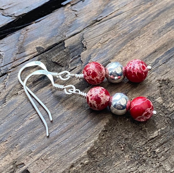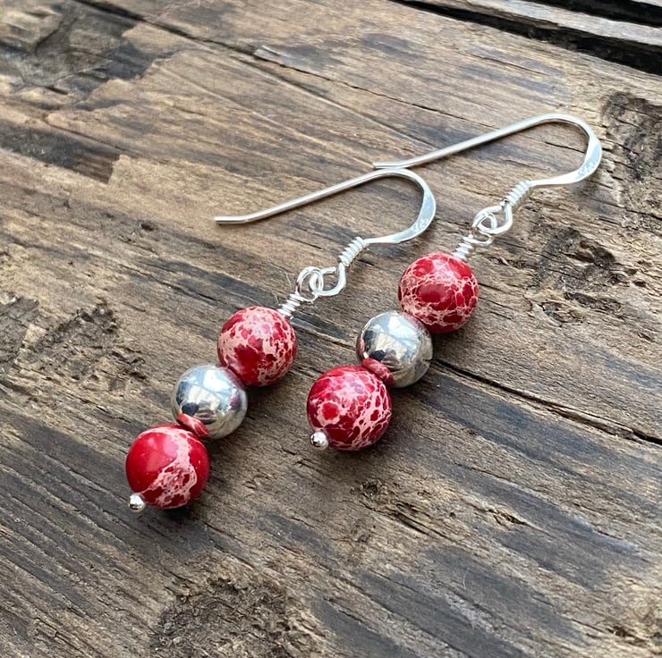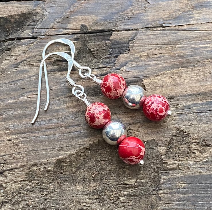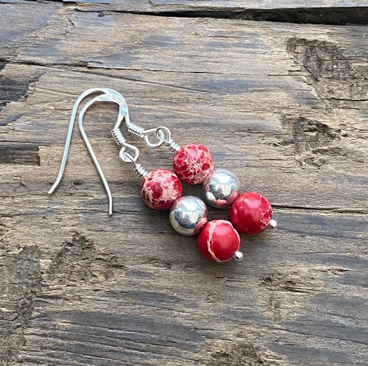 6mm red Jasper beads separated with 6mm sterling silver beads hand wired onto sterling silver headpins and hung upon sterling silver ear wires.
