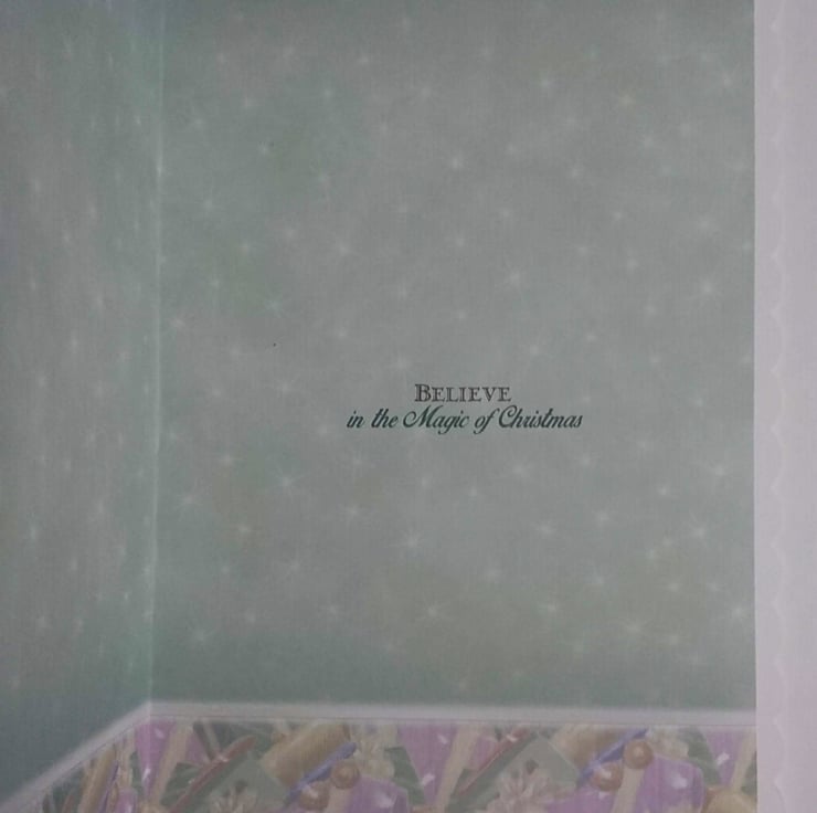 The inside of the card has a double full colour insert and has a printed greeting "Believe in the Magic of Christmas". There is plenty of room for you to write your own special message.