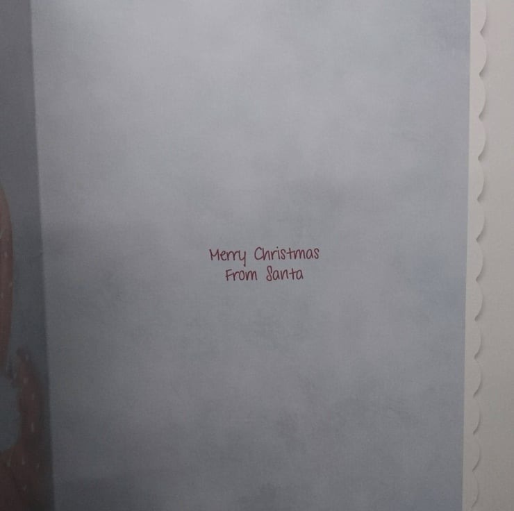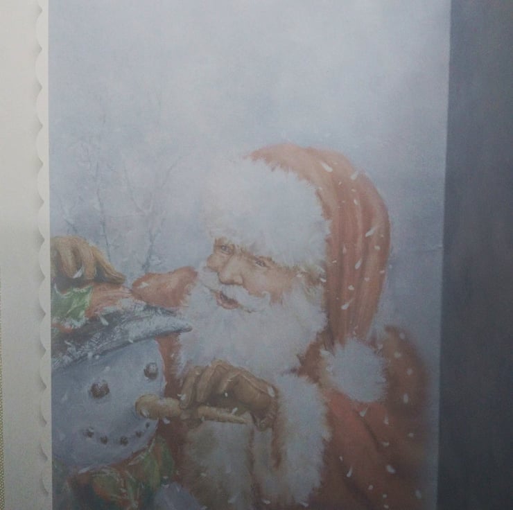 The inside of the card has a double full colour insert and has a printed greeting "Merry Christmas from Santa". Santa is fixing a carrot to the Snowman, and there is plenty of room for you to write your own special message.