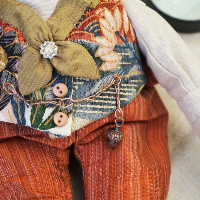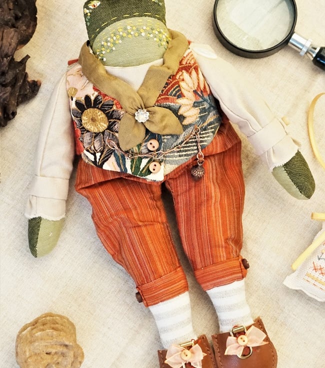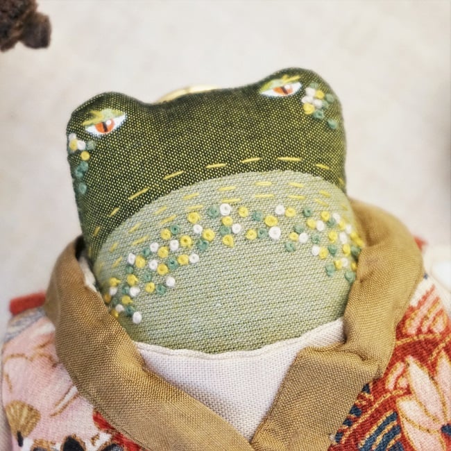 Monsier is a tiny grumpy frog with a sweet nature. He stands just nine inches tall. He is a tubby frog with hand painted features and hand embroidered details. He is dressed in Japanese vintage hand painted silk and silk dupion